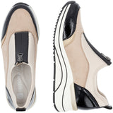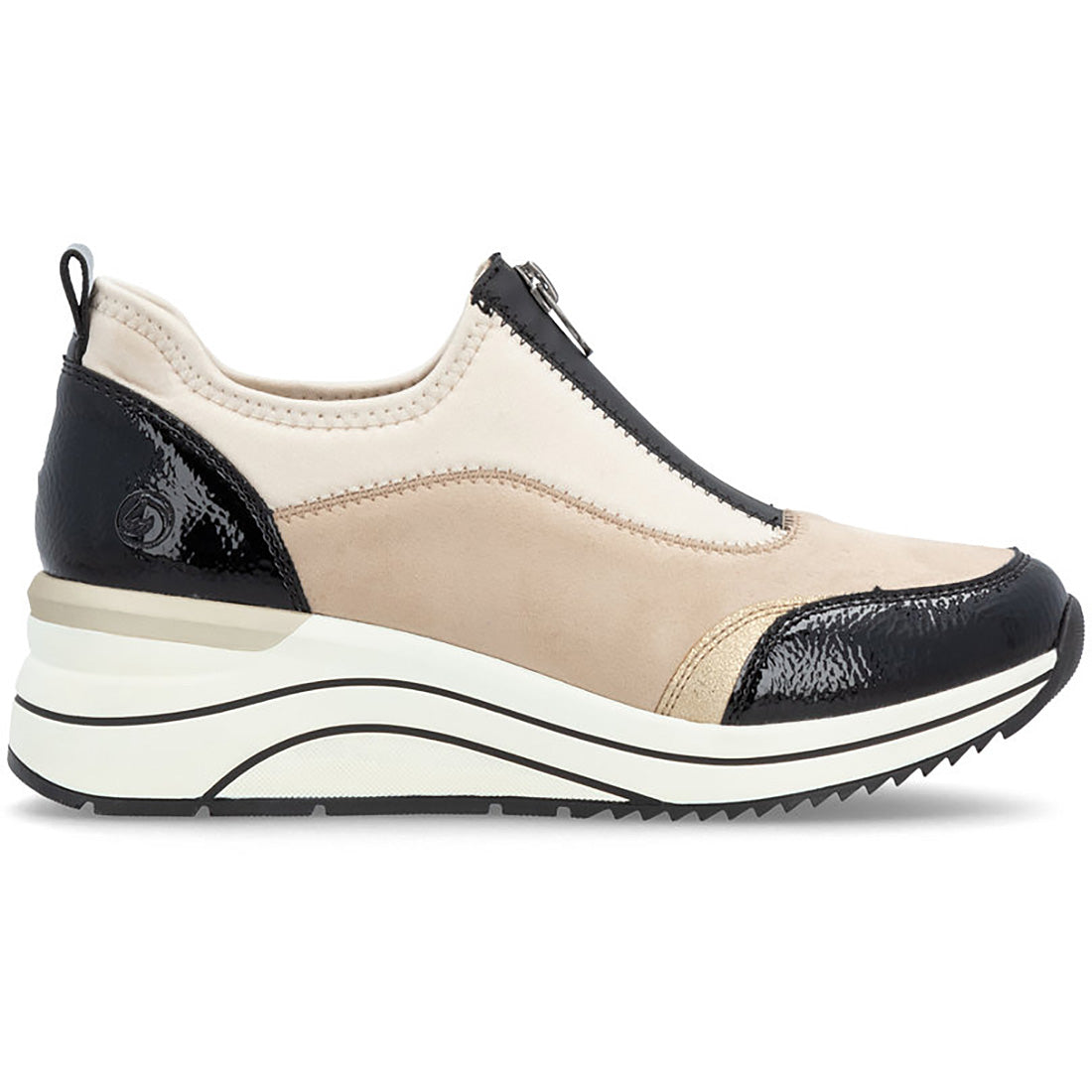 The Remonte D0T08-60 women's champagne casual shoe is a versatile and stylish option suitable for many occasions. These sneakers are easy to slip on with a front zip fastening and an elasticated shaft edge. The Lite 'n Soft technology integrates a super lightweight sole with a padded, removable insole for enhanced comfort. Designed with a sense of style, these ladies' vegan trainers are extra wide and available in oversizes to ensure a comfortable fit for all.
