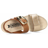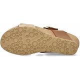Feminine and casual, this wedge sandal is a summer essential. SOFT-AIR technology integrated into the cork wedge arch ensures comfortable, fatigue-free walking. AIR-RELAX technology respects and preserves the anatomy of the foot. Adjustable hook-and-loop straps with decorative buckle for optimum comfort. This beige model for women is made of metallic-effect leather with a fancy print on the front of the foot and bold nubuck leather on the back.
