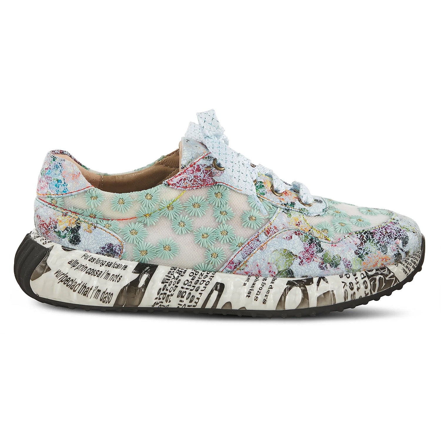Push yourself out of your comfort zone with these daisymae sneakers. Following the the shoe are daisys and handpainted crackle floral patterns. The newspaper drop heel outsole and metallic laces spice up this sneaker.