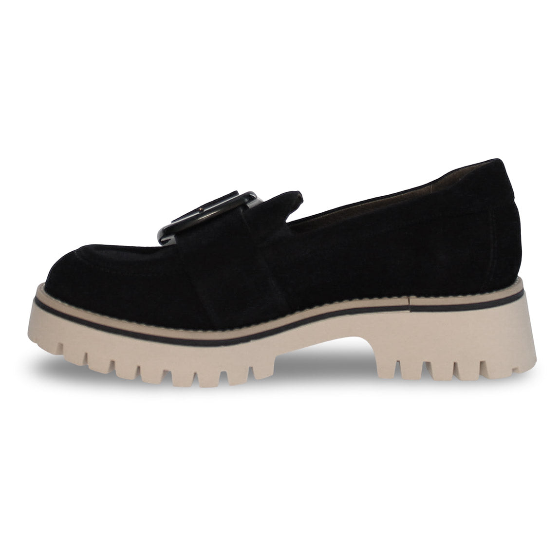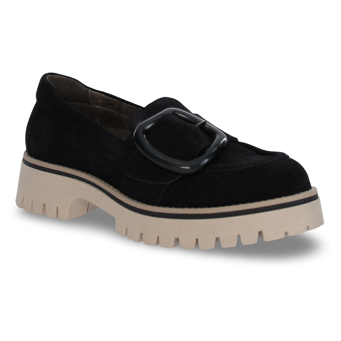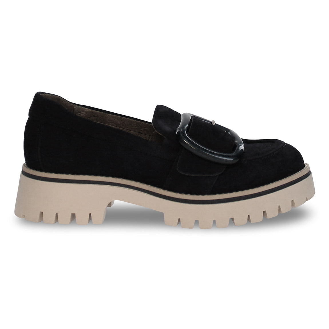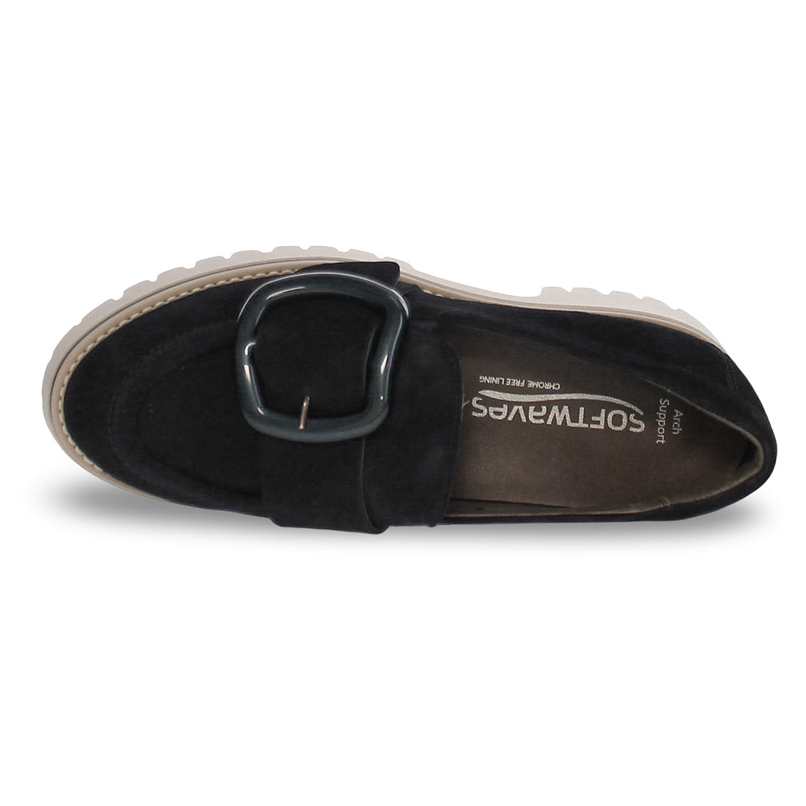 Step out with flair in the SOFTWAVES suede loafer, starring a stunning ombre resin buckle that steals the spotlight. Elastic goring beneath the tongue ensures a comfy, flexible fit, while the hand-stitched welting showcases fine craftsmanship. The chunky 1-inch lug sole climbs to a bold 2 3/4-inch heel, adding height and swagger, paired with a non-slip sole for steady footing. Inside, a removable footbed and arch support keep you cozy, making this
