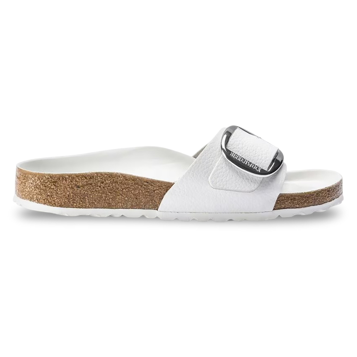 The original BIRKENSTOCK Sandal. A strap, a buckle, and a contoured cork footbed are masterfully combined to create the Madrid. An iconic slide with an amplified buckle accent. The semi-exquisite footbed is fully lined with soft piumato leather, making it exceptionally comfortable. The upper is made from high-quality natural leather with a high shine finish.