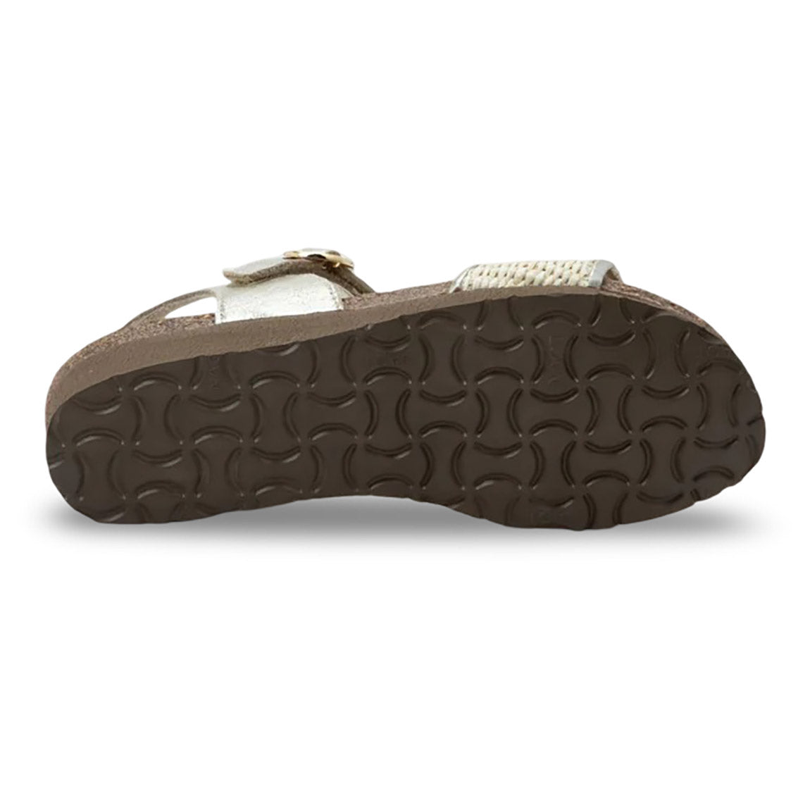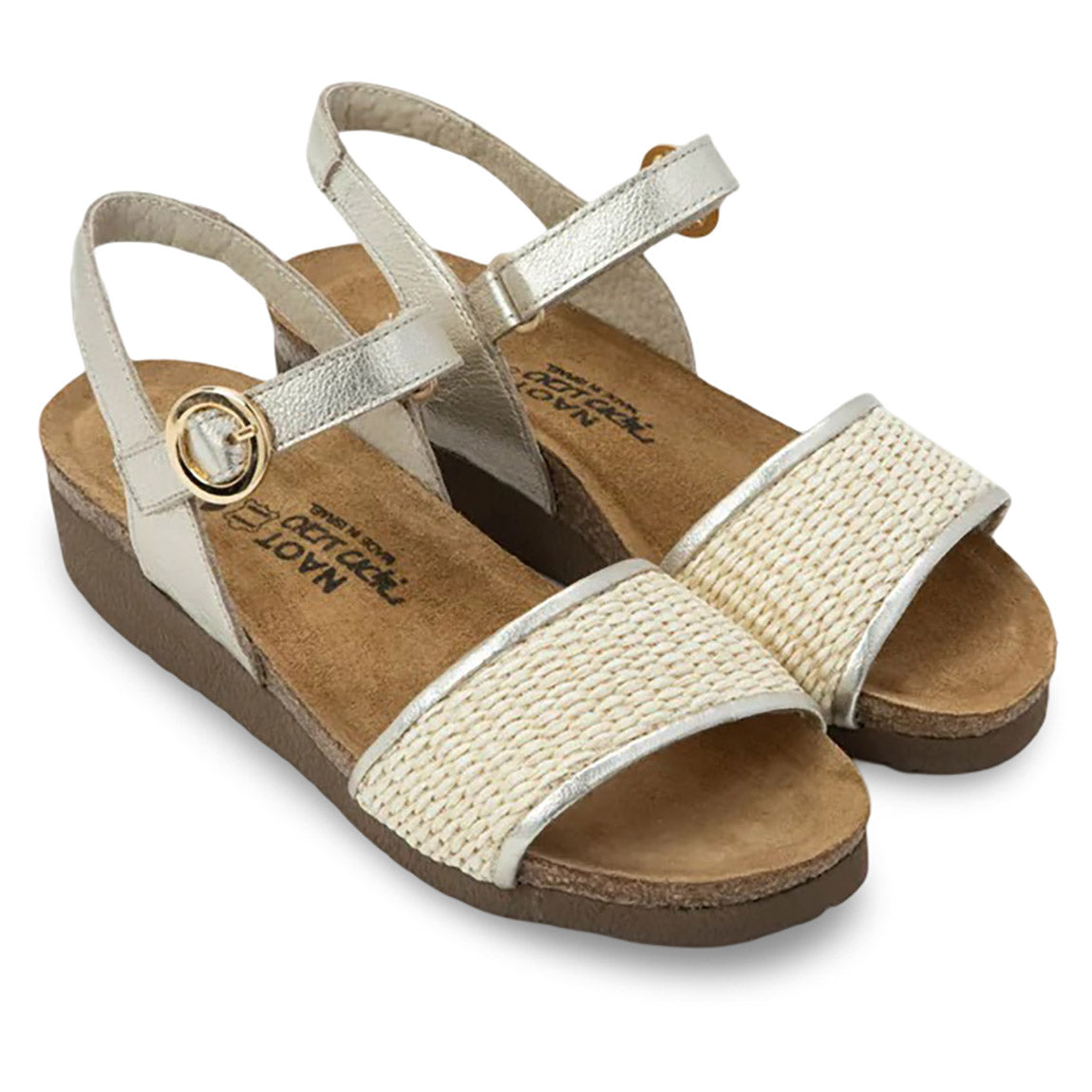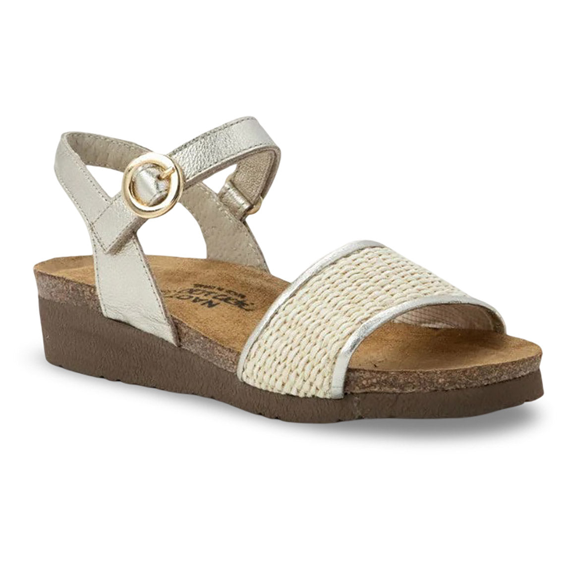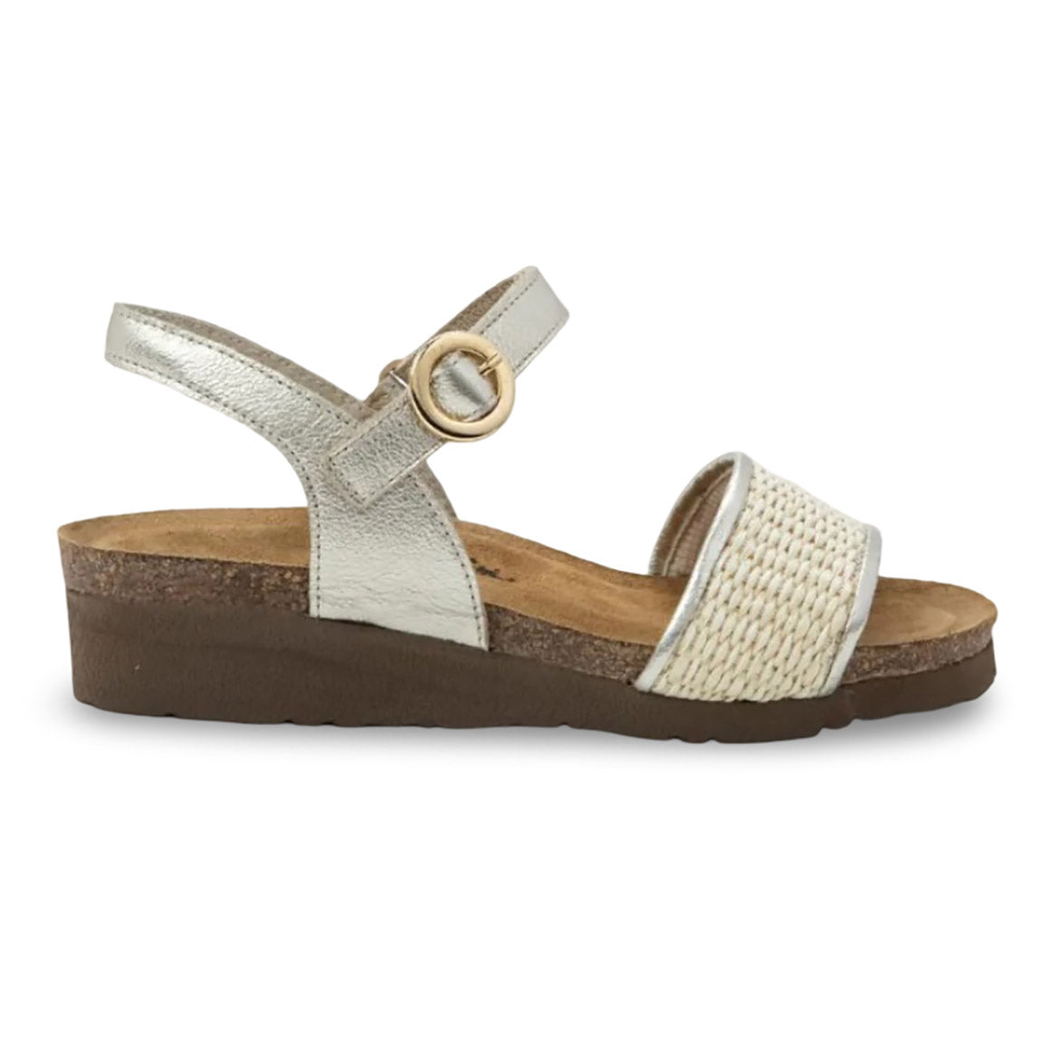 Meet Cecile - the perfect harmony of comfort and elegance. This backstrap sandal boasts a chic design with a faux buckle hook and loop strap and raffia detailing on the front strap, adding a touch of natural charm to any ensemble. The adjustable closure provides ease and convenience, ensuring you never have to sacrifice style for comfort. Cecile is the ideal choice for any occasion. Crafted with Naot's anatomic cork and latex footbed wrapped in pampering suede and molds to the shape of your foot with wear, ensuring personalized comfort. Plus, it's accepted by the American Podiatric Medical Association (APMA) for promoting good foot health. The Elegant Collection's 1.5" EVA sole offers both elegance and support.