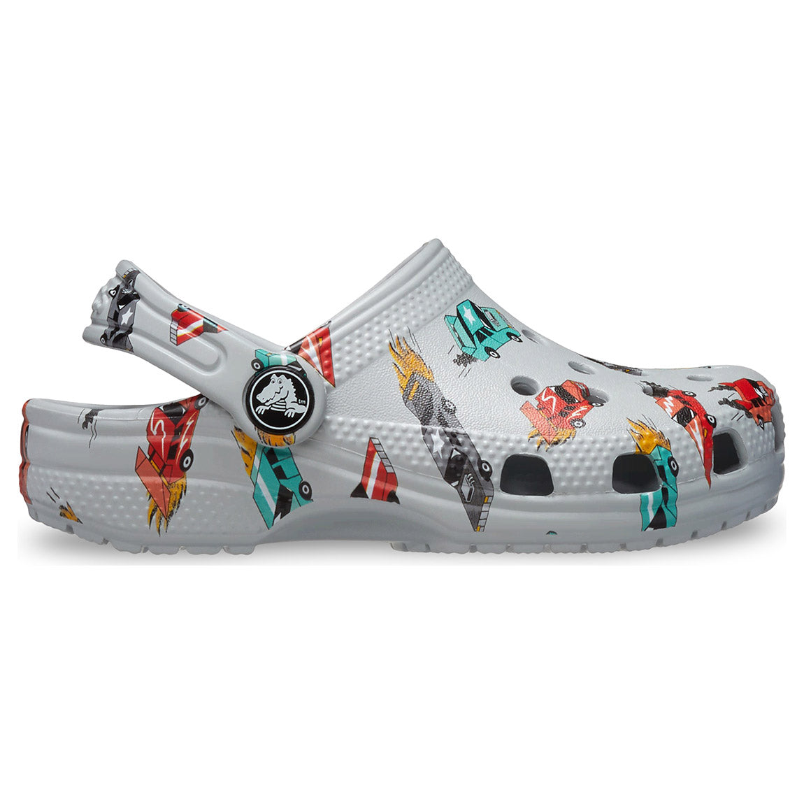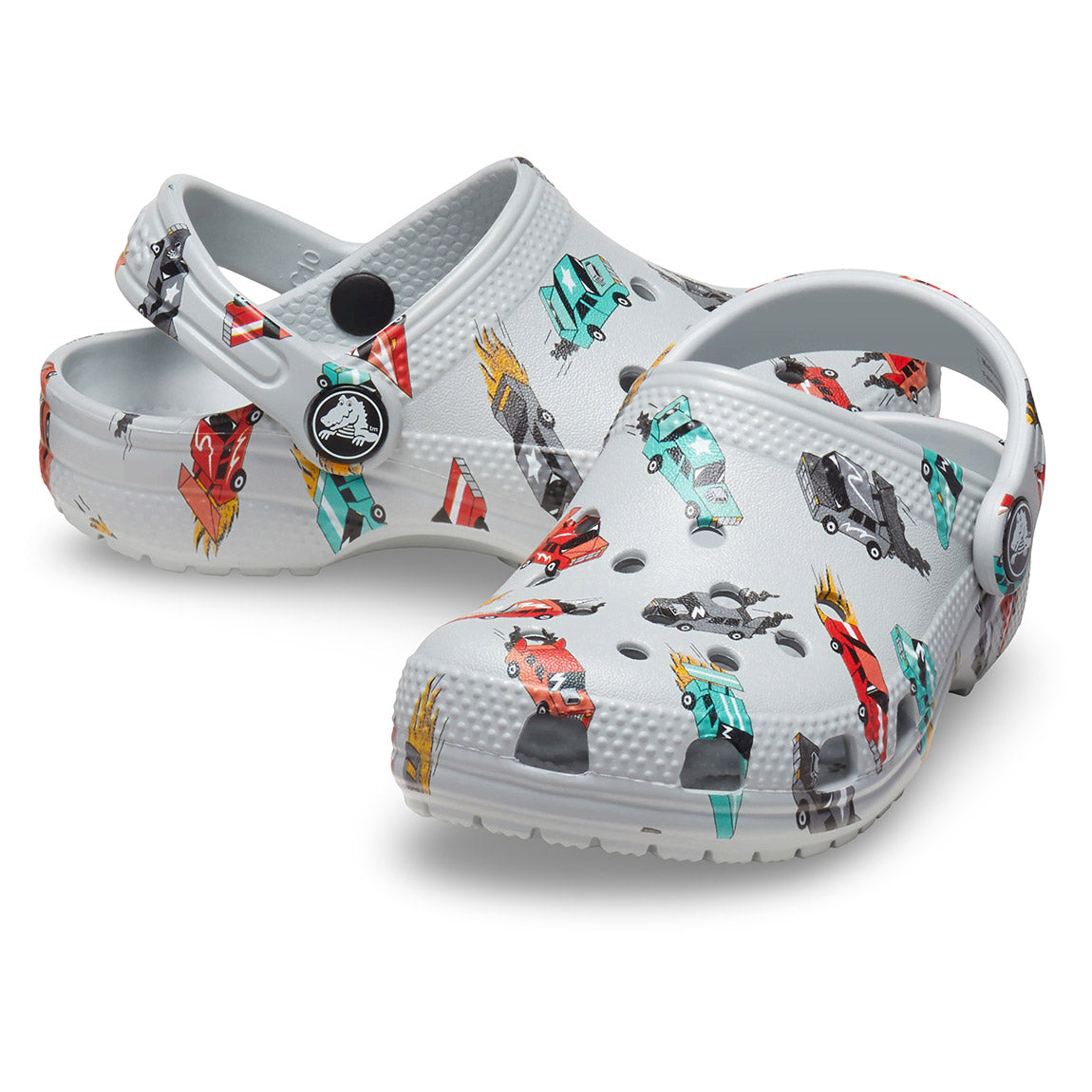 Lightweight and ultra-durable Croslite foam construction. Race car graphic details. Roomy design and pivoting heel strap for easy-on and off. Waterproof silhouette is perfect for puddle-jumping and is easy to clean. Flexible, cushy Iconic Crocs Comfort underfoot. The Crocs Race Car Classic Clog Shoes are imported. Dress your little one up in speedy style with the Kids' Toddler Crocs Race Car Classic Clog Shoes. These are the comfy Crocs you know and love covered with cool race car graphic details.