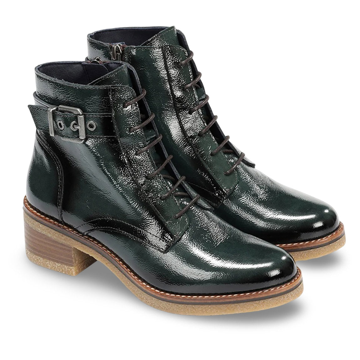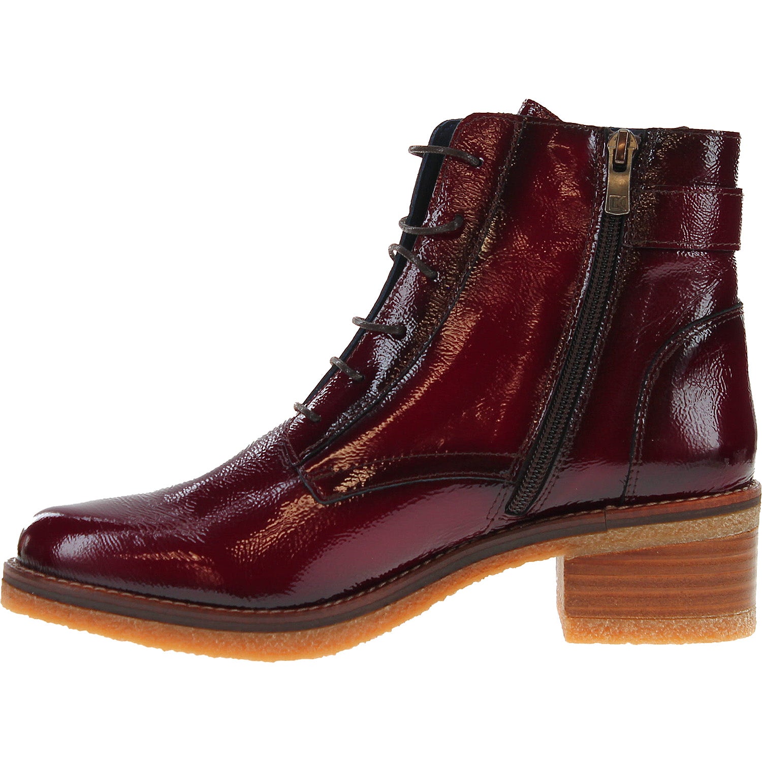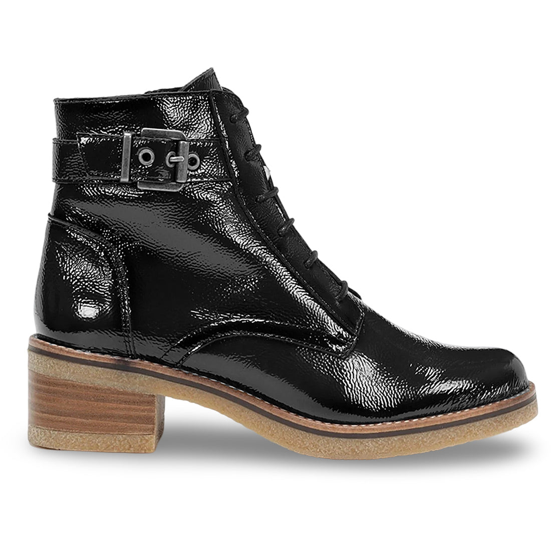 A gorgeous, sophisticated patent leather ankle boot. The Lurcero effortlessly manages to be both dressy and casual simultaneously. Glossy, soft, patent leather uppers, combined with chic, understated round laces show its elegance, while the stacked wooden heel and rubber outsole give it a confident, casual vibe. Made in Spain.