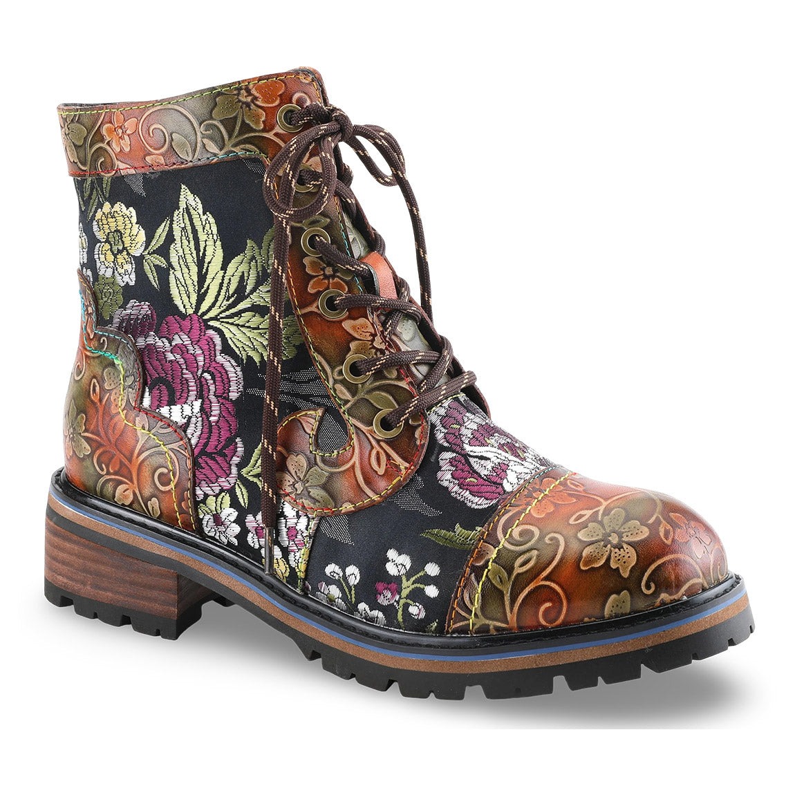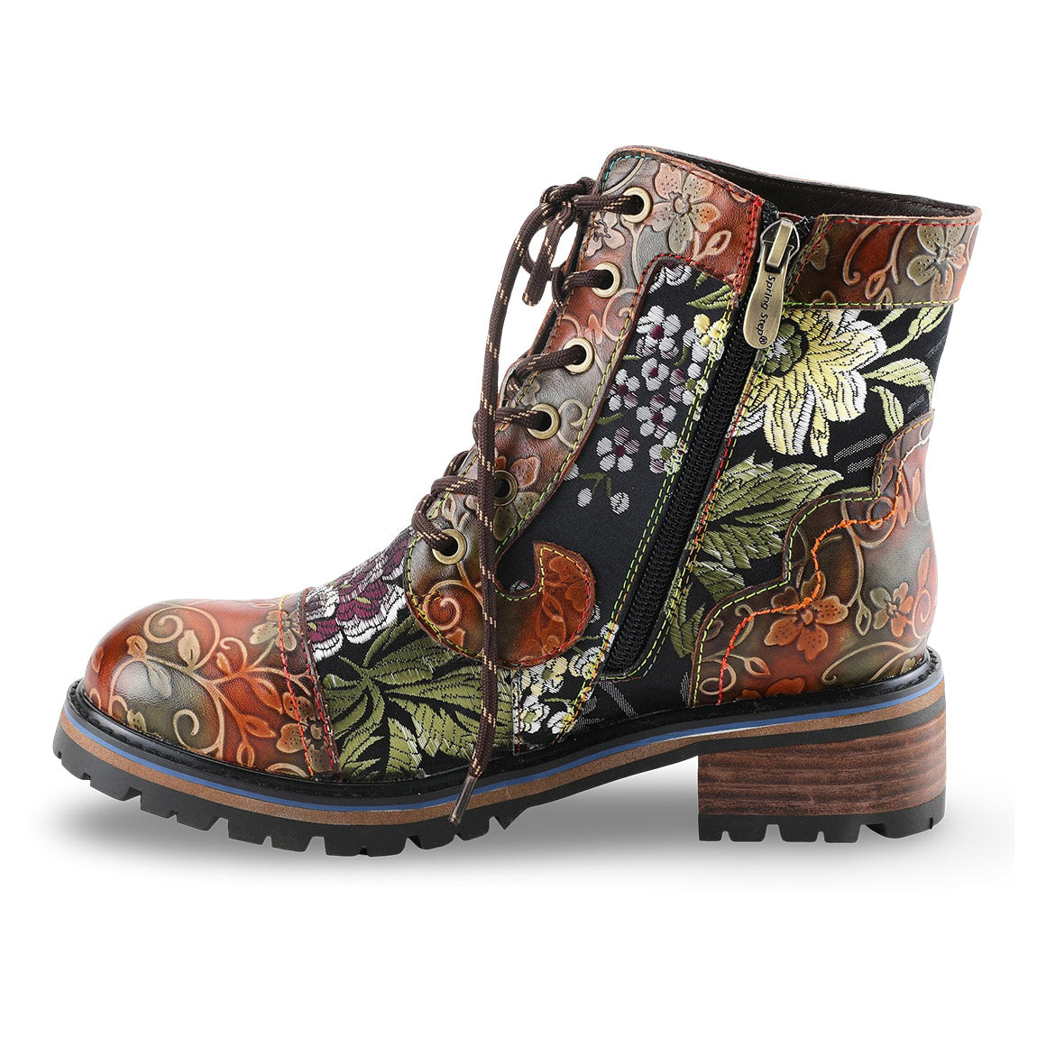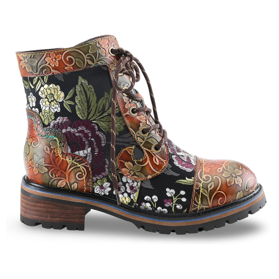 Incredible leather combination bootie showing an embroidered textile and embossed floral leather on a comfort lug sole.