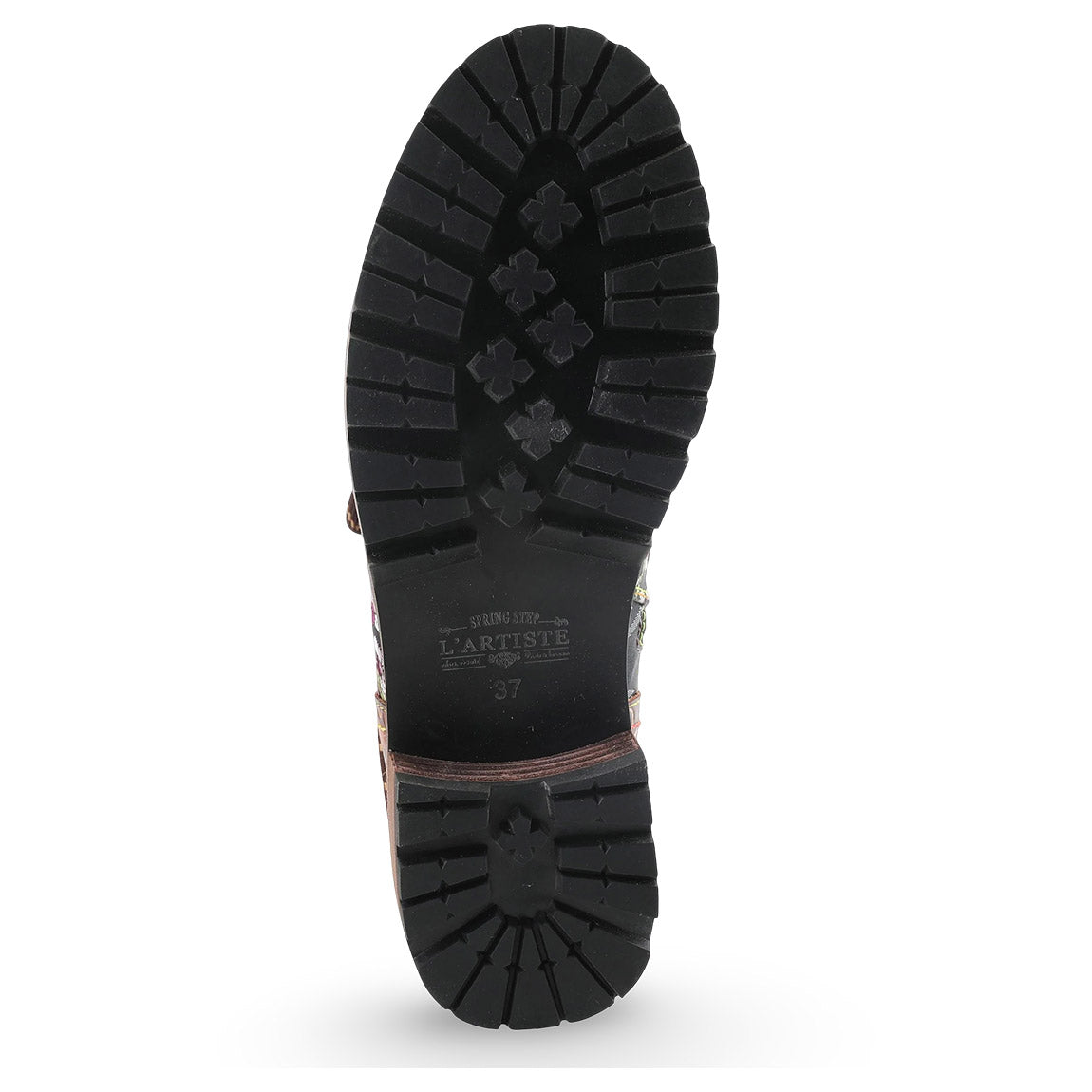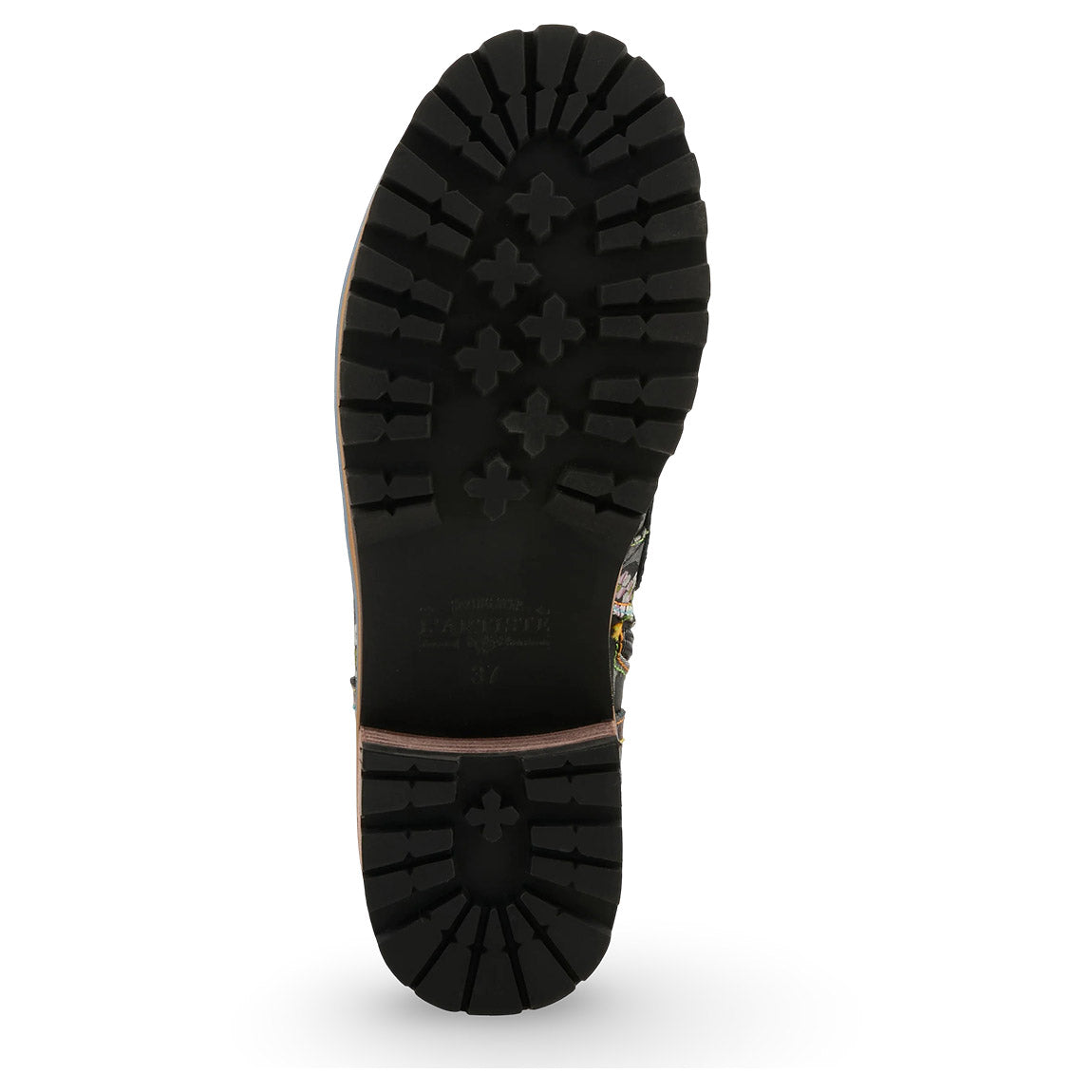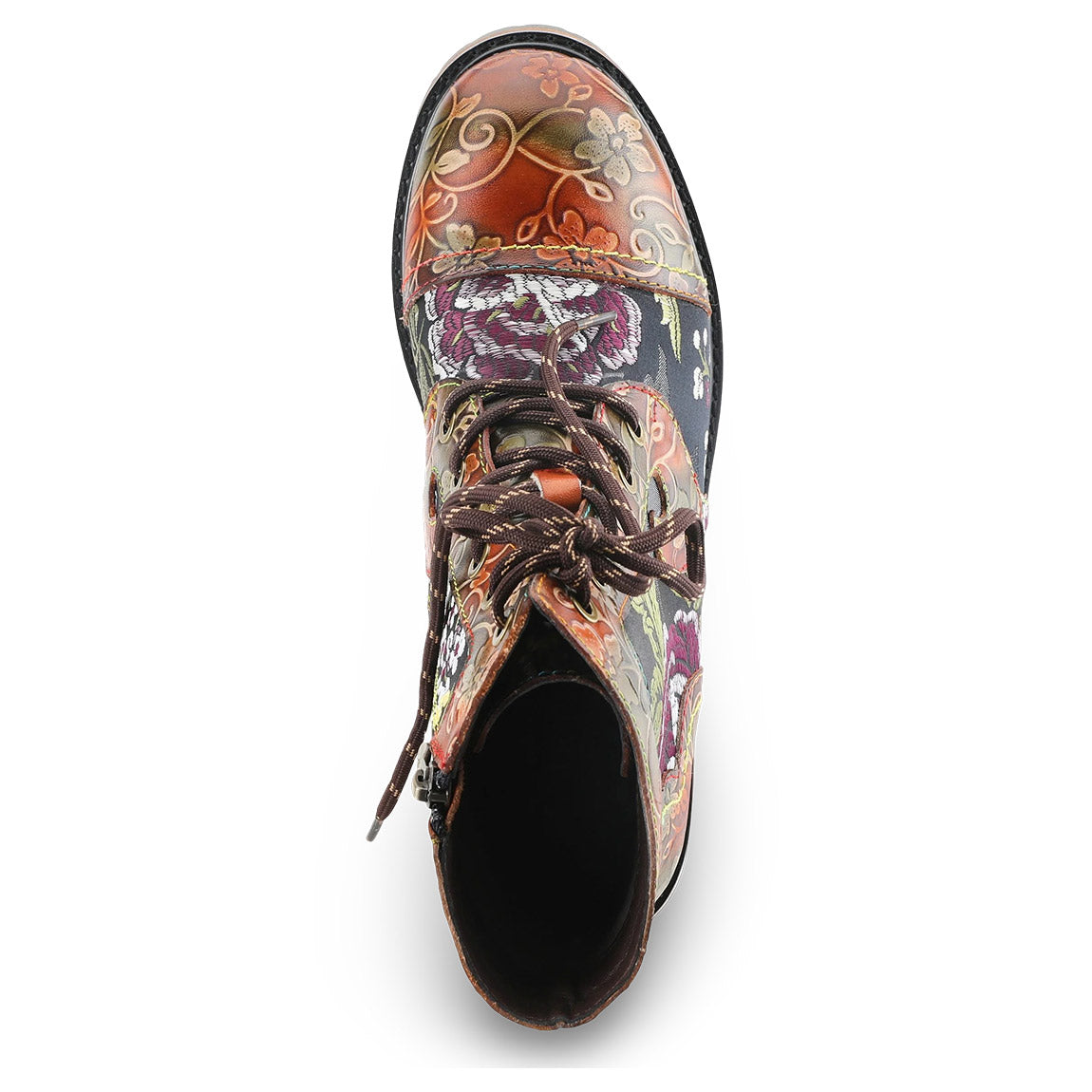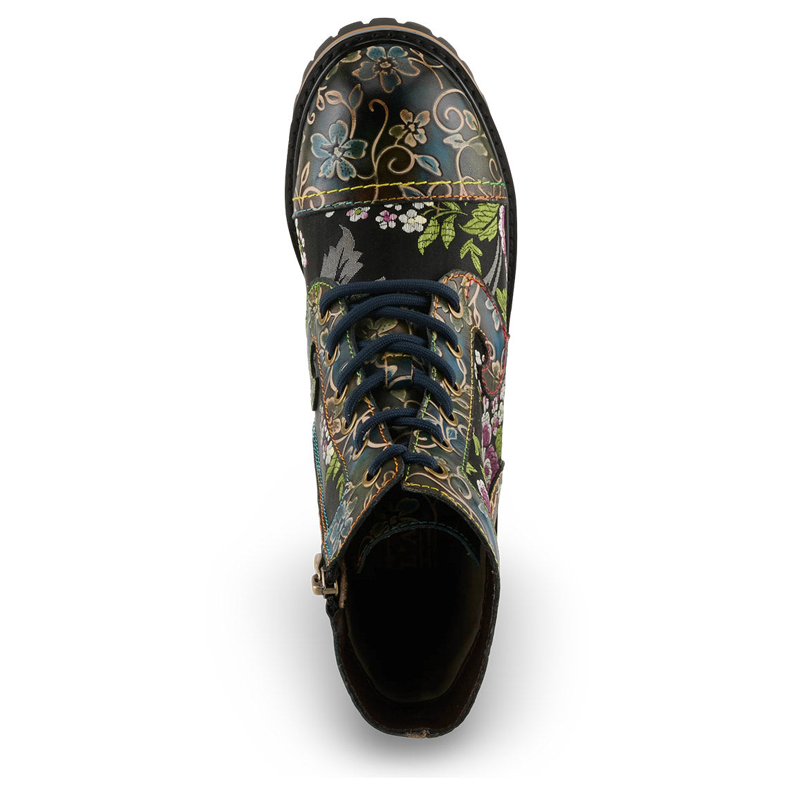 Incredible leather combination bootie showing an embroidered textile and embossed floral leather on a comfort lug sole.