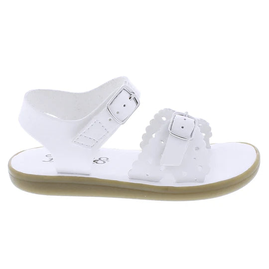 Open-toe, open-heel microfiber sandal featuring true-buckle forefoot strap with decorative tear-drop perf design and hook-and-loop ankle strap with decorative buckle. Offered in matte and metallic colors; sizes ranging from 1.0 infant - 3.0 youth.