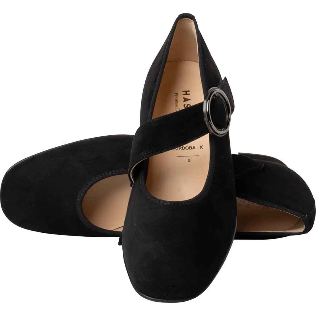 The Cordoba pumps are classically elegant – a chic shoe with a small heel. The HASSIA pumps are the ideal choice if you don't want to compromise on style or comfort. The fullness "Comfort Plus" (K) gives the foot plenty of room and the characteristic HASSIA soft step with the additional padding in the ball area offers an optimal fit throughout the day. The narrow Velcro strap offers additional support and makes it easier to take off and put on. The jewelry clasp can also be removed if desired. The high-quality genuine leather upper made of black velvet gives an elegant look, while the stable block heel with a height of 2.5 centimeters ensures a secure hold. The shoe also has a removable footbed and lambskin lining. With this model you are investing in comfortable pumps for wide feet - the perfect companion for festive occasions or in the office.