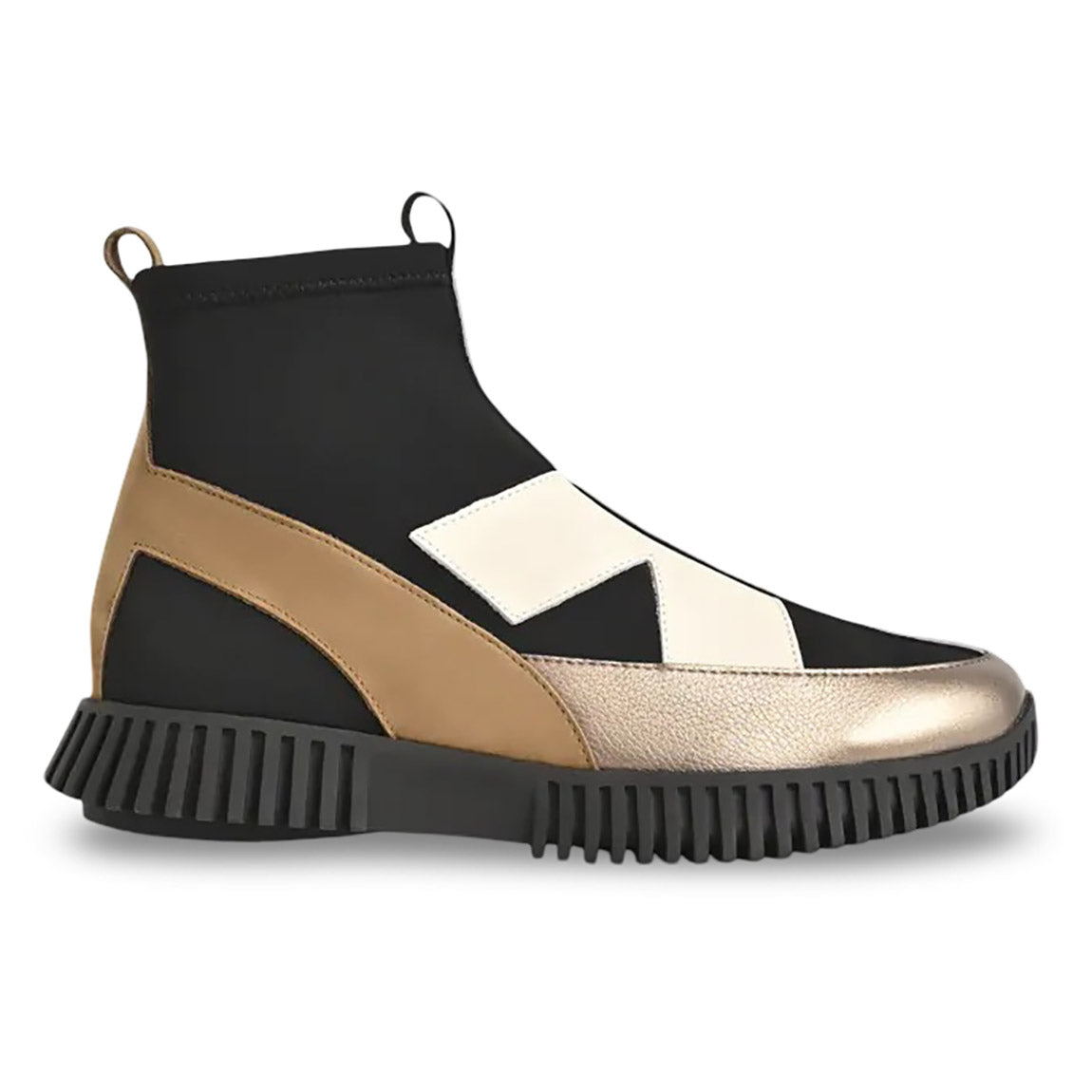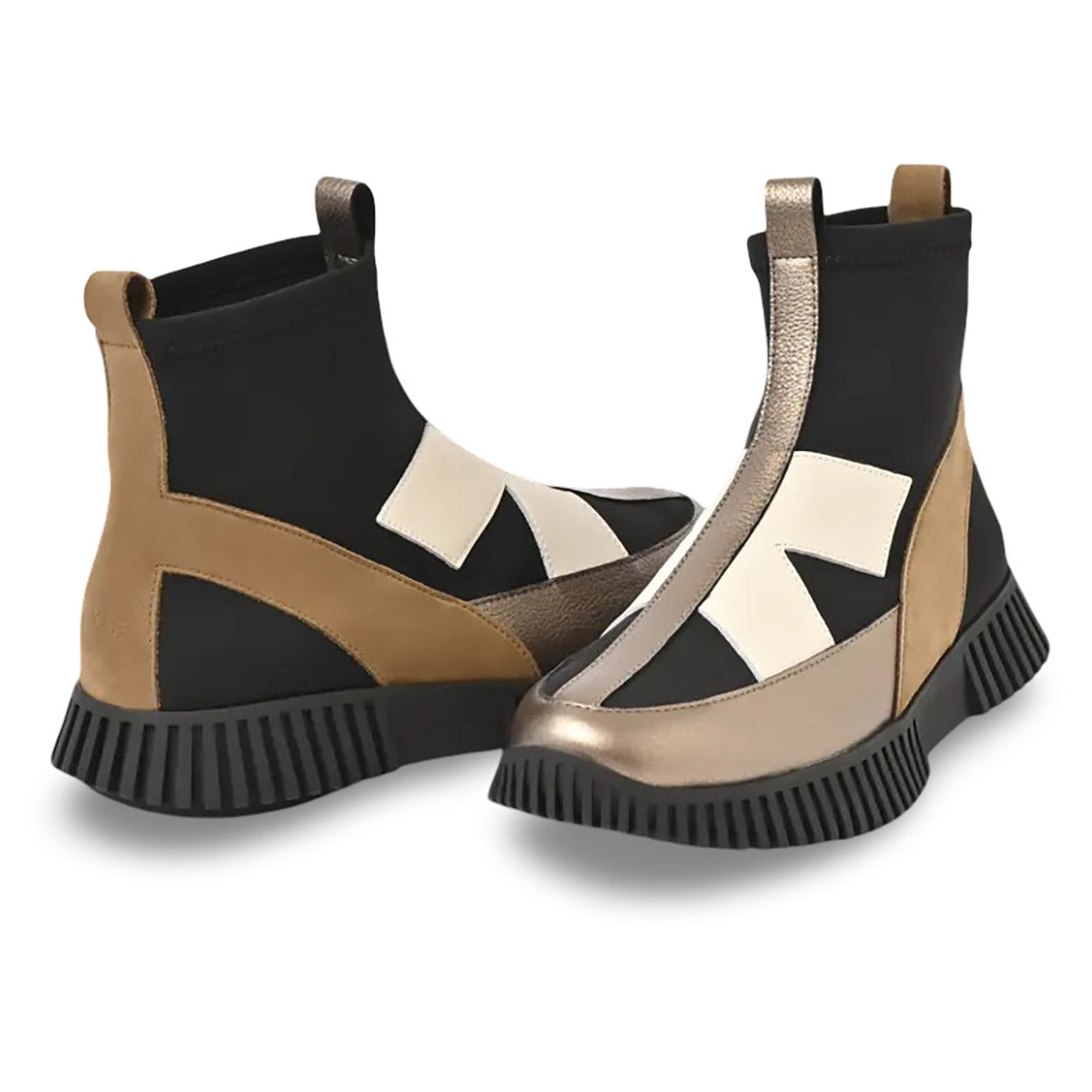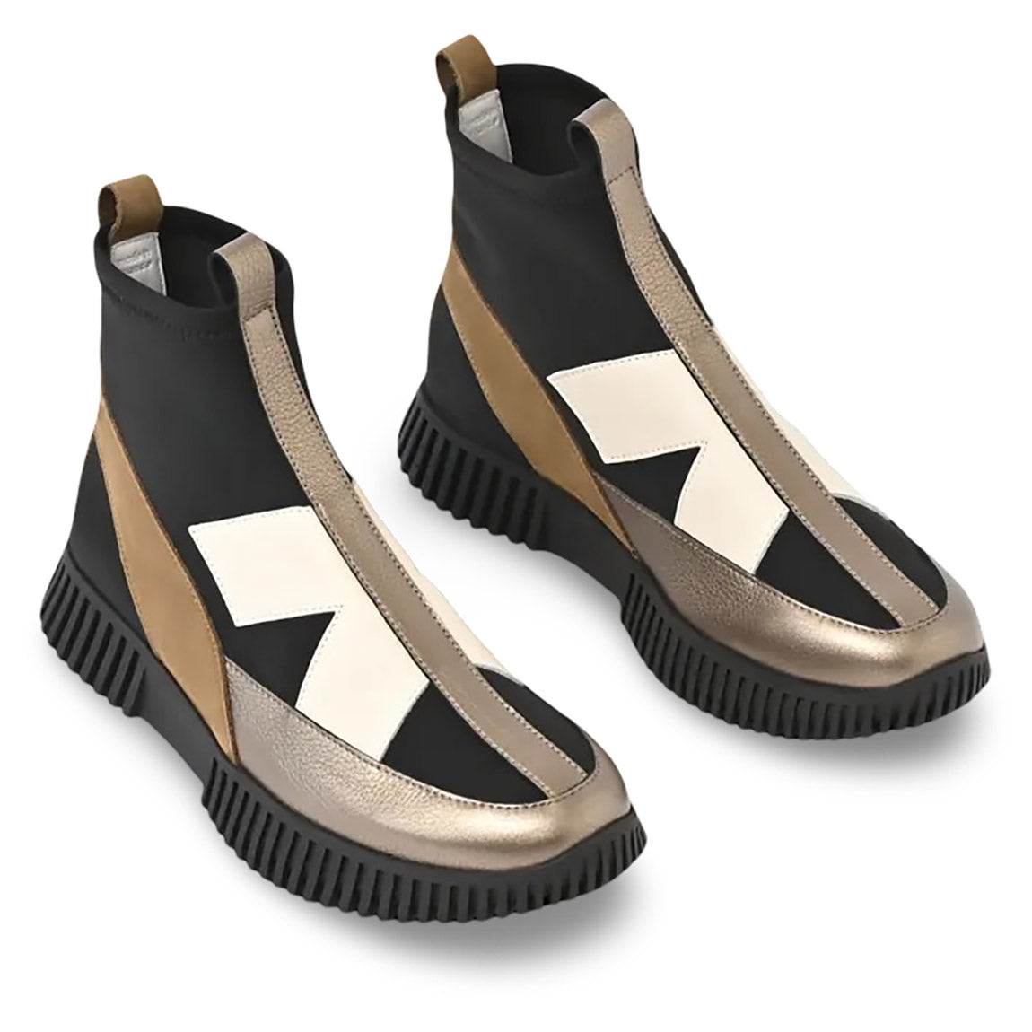 Step up your style with the Haveke high-top sneaker from Arche! Crafted from soft timber leather and stretchy fabric, it flaunts a fun mix of black, metallic, tan, and white shades against a sleek black base. The black sole’s straight tread adds a cool, modern edge to this playful design.