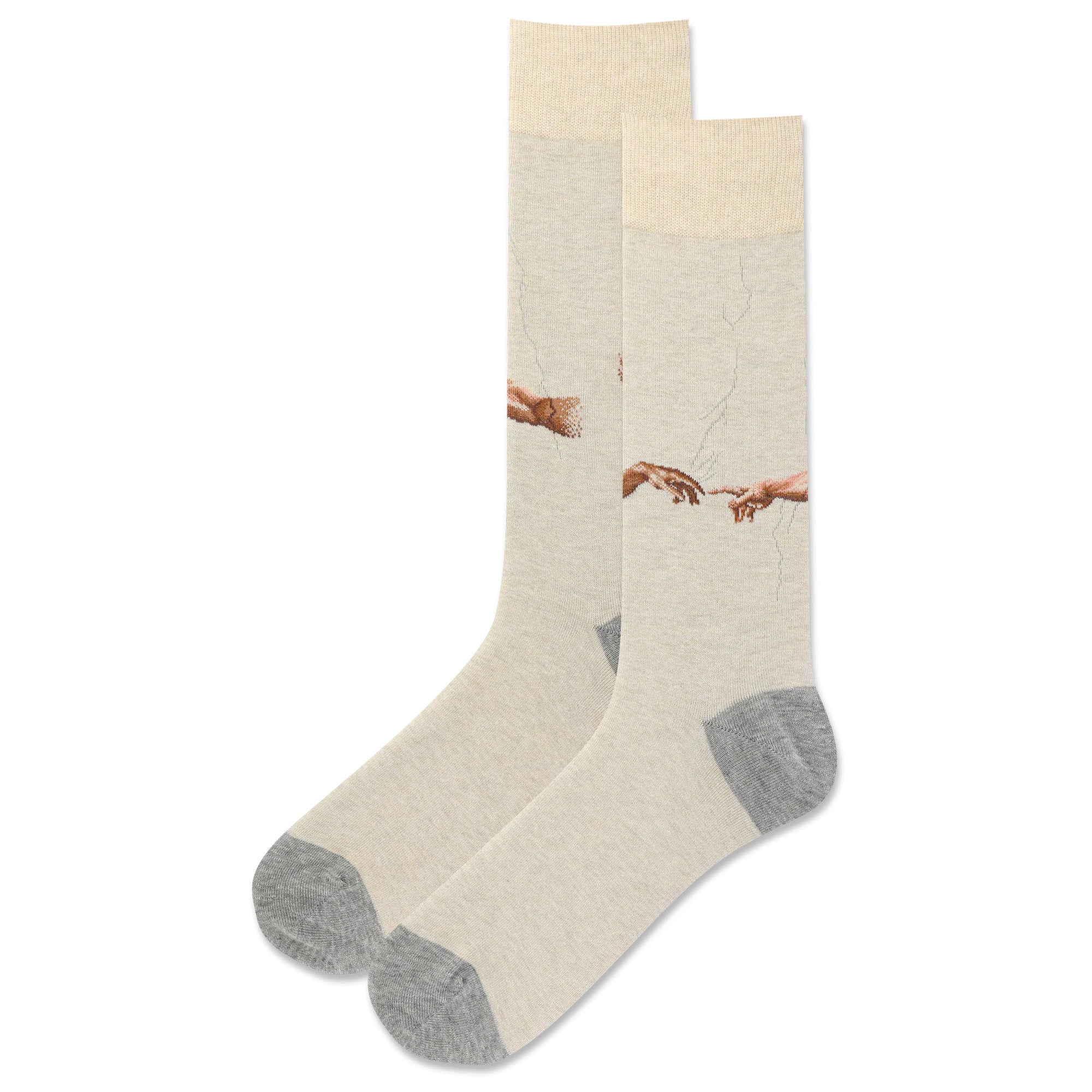 Step into your own personal art gallery in the Creation of Adam socks based on a fresco painting which forms part of the Sistine Chapel’s ceiling. The sock illustrates the biblical creation narrative from Genesis in which God gives life to Adam, the first man.