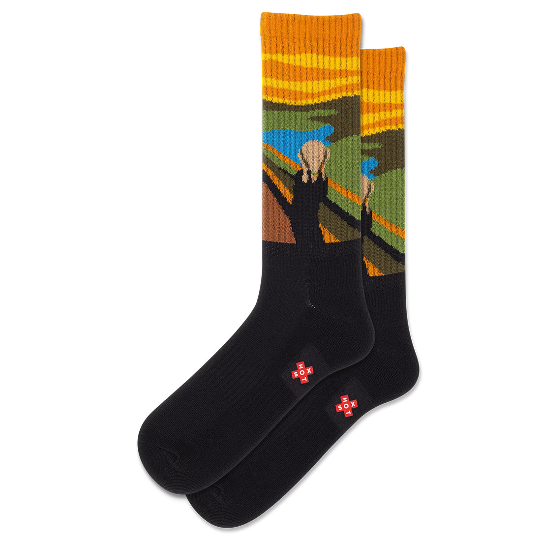 Show off your bold style in these socks. Featuring the iconic artwork of Munch's The Scream, these statement socks will keep your feet nice and snug with arch support and cushioned soles. Even better, the polyester yarn construction will make you want to scream for joy.
