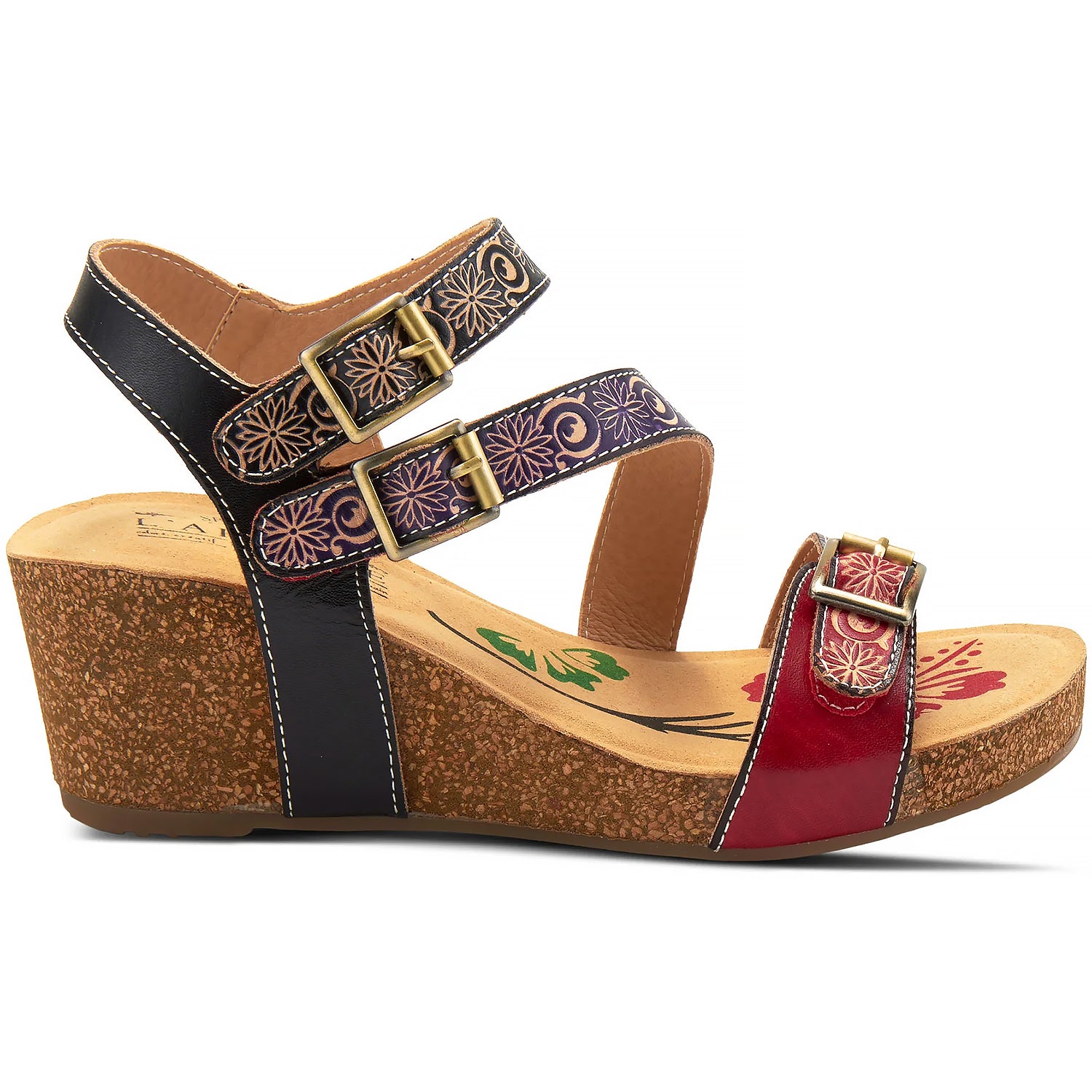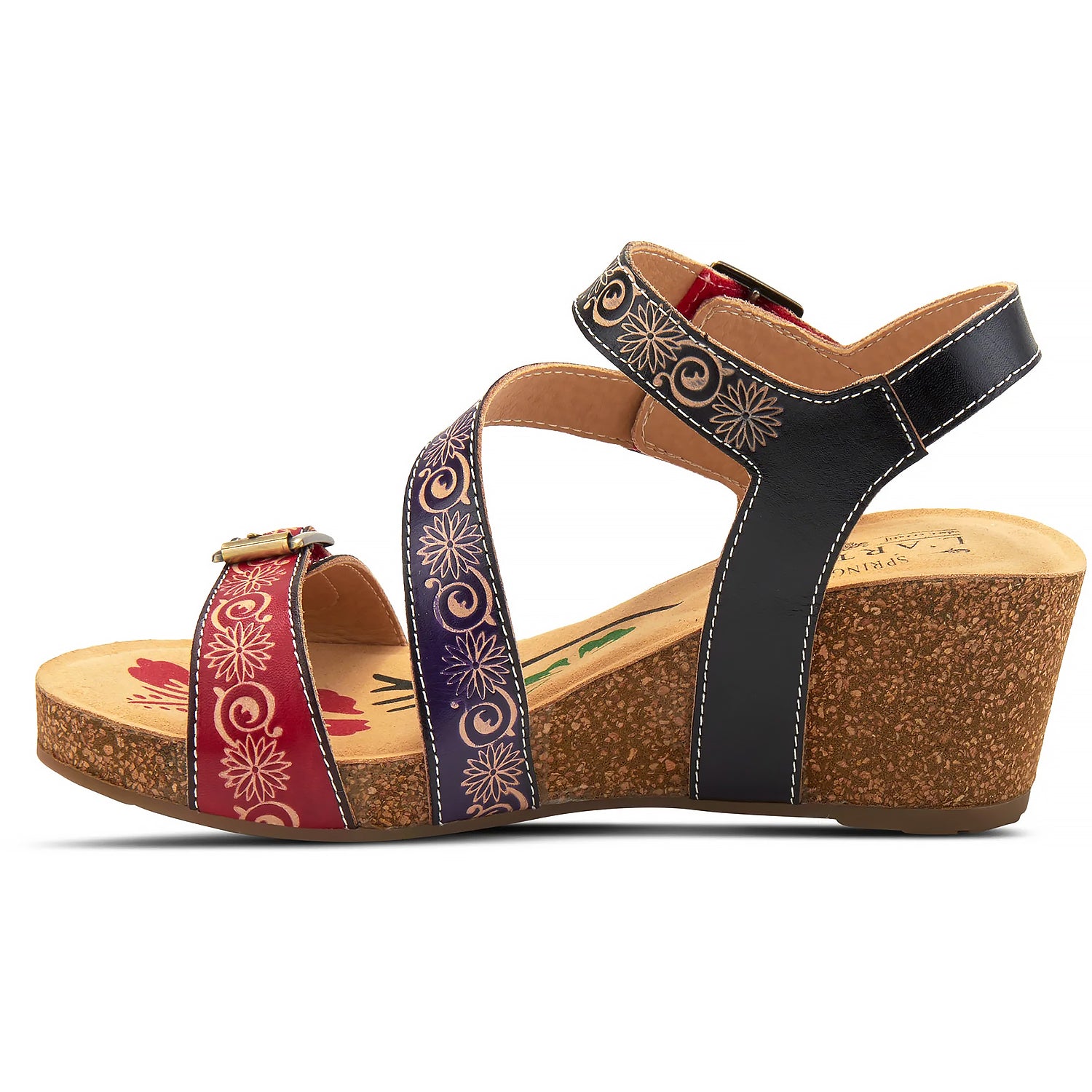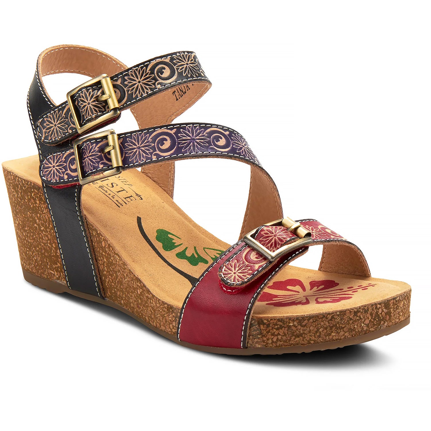 The L'Artiste by Spring Step TANJA quarter strap sandal is a stylish French inspired, beautiful hand-painted premium leather asymmetrical sandal featuring a floral embossed pattern on each of the three different colored, adjustable hook and loop straps all on a cork-infused, comfort wedge.