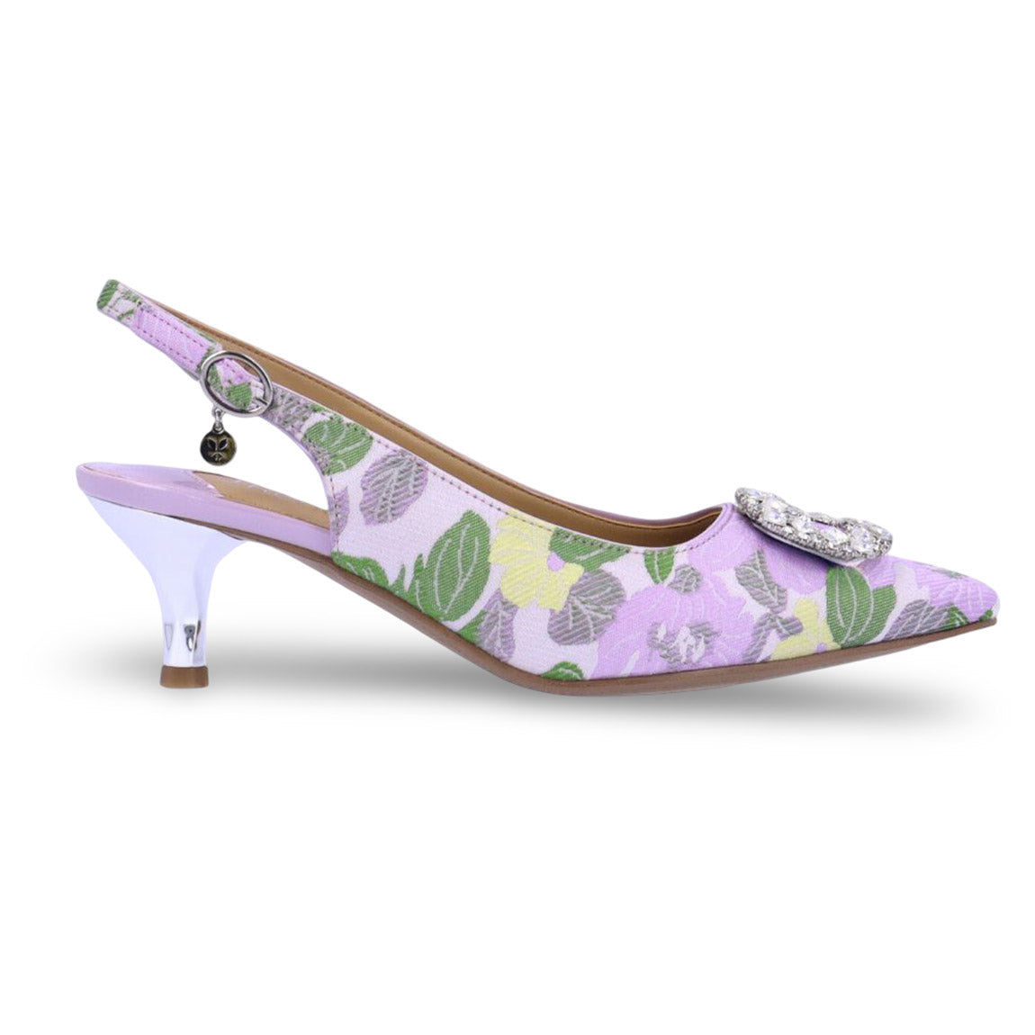 This fabric pump has a pointy toe, memory foam+latex insole, synthetic lining and synthetic outsole. This style also features a buckle closure on a 2 inch heel.