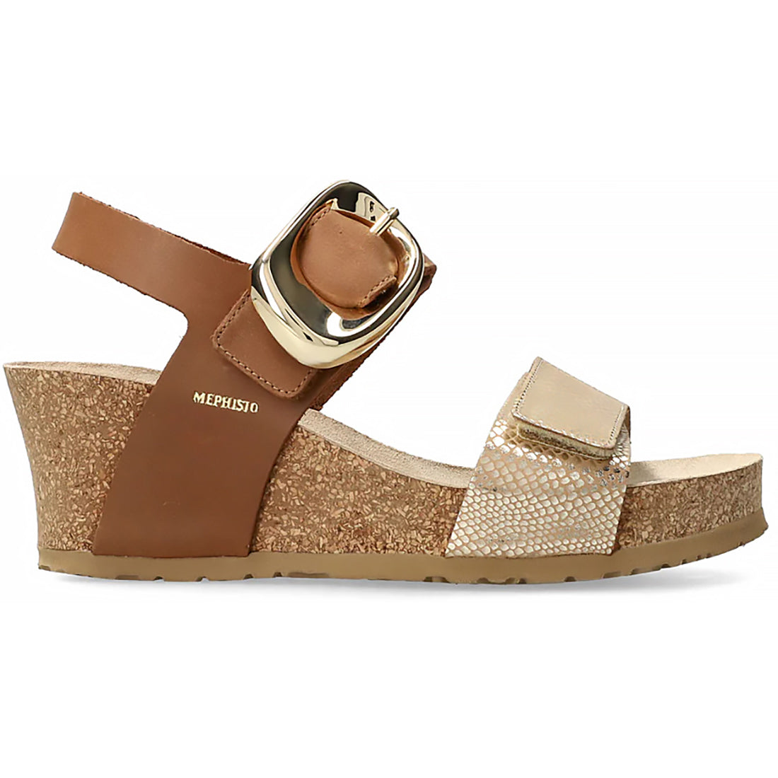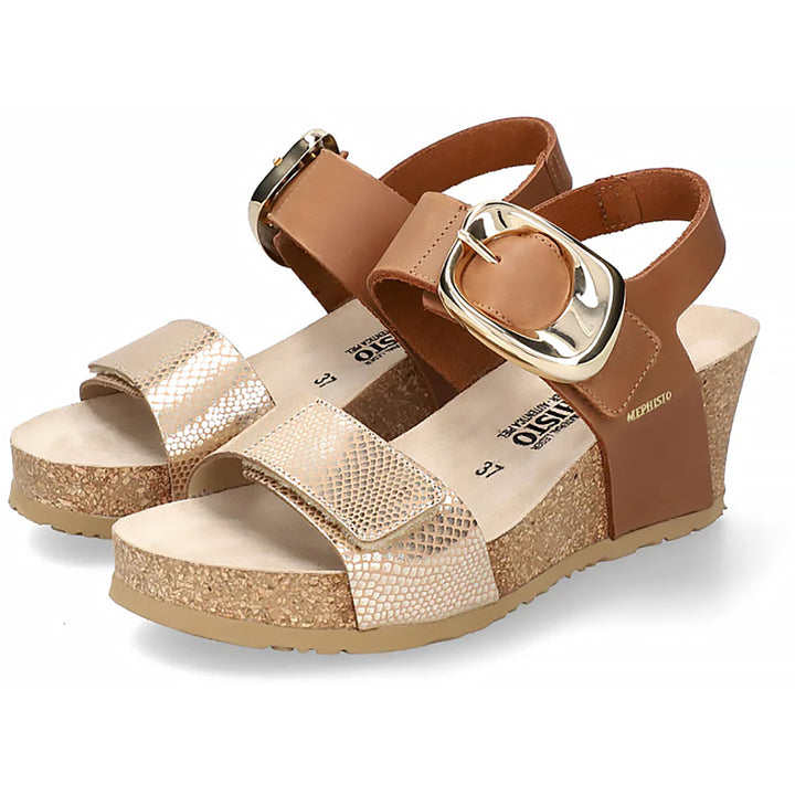 Feminine and casual, this wedge sandal is a summer essential. SOFT-AIR technology integrated into the cork wedge arch ensures comfortable, fatigue-free walking. AIR-RELAX technology respects and preserves the anatomy of the foot. Adjustable hook-and-loop straps with decorative buckle for optimum comfort. This beige model for women is made of metallic-effect leather with a fancy print on the front of the foot and bold nubuck leather on the back.