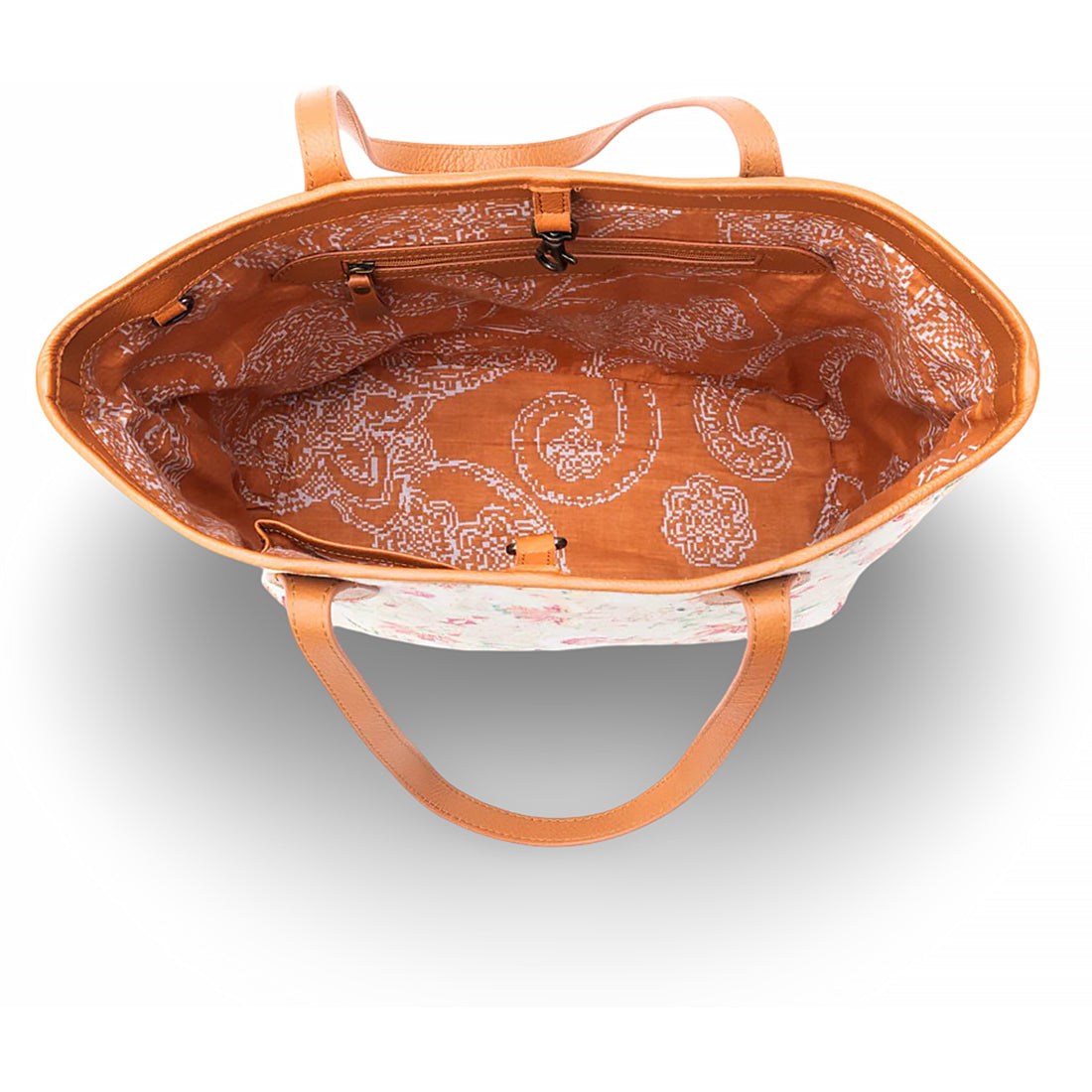 Escape to paradise with our tropical palm print tote, crafted from upcycled canvas and trimmed with luxurious cognac leather. This eco-conscious carryall comes with a matching pouch, perfect for beach adventures or city exploration. Zipper-close top, with durable carrying handles in matching leather. Your sustainable style statement awaits!