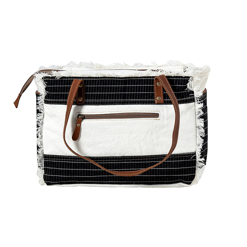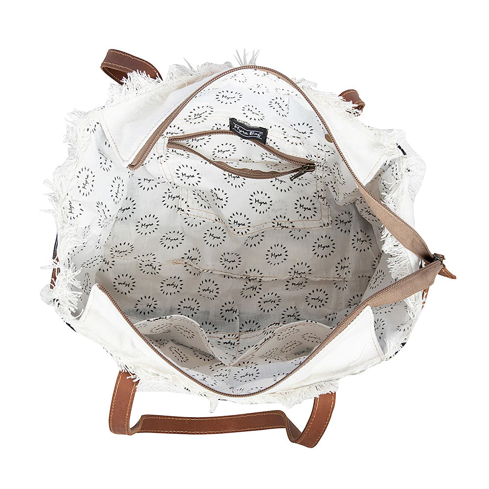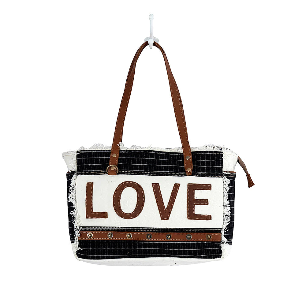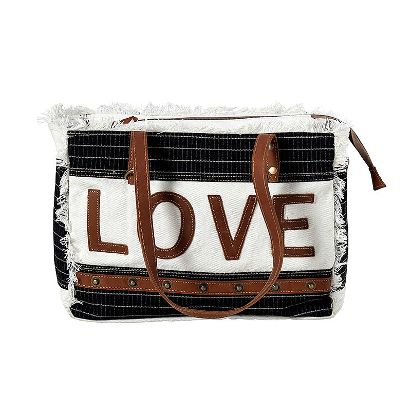 This wonderful bag offers so much – starting with its wonderful message – love! The leather letters are individually stitched. The bag features a white canvas bodice trimmed in dark patterned canvas with an rich chocolate leather accent. The reverse features a handy zippered pocket for extra convenience. Fringe accents on edges complete the look. Zipper close top. Leather carrying straps in matching leather.