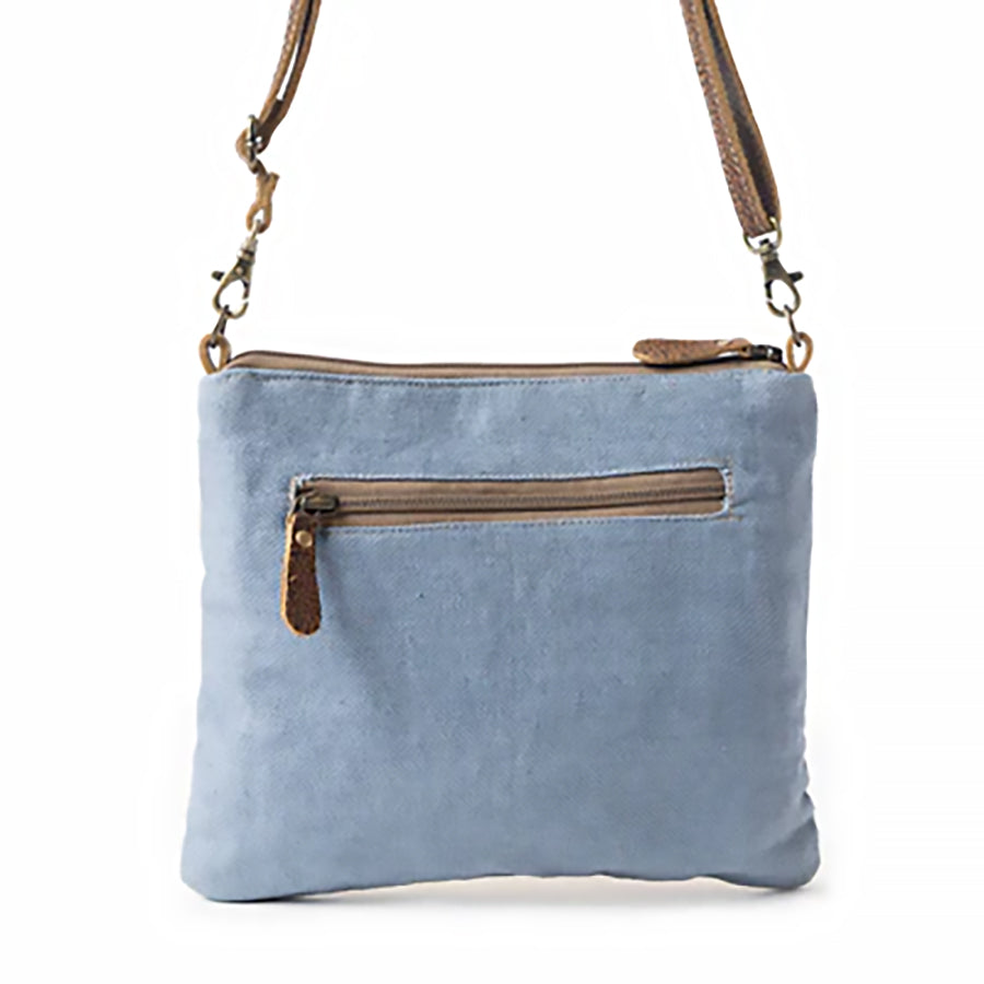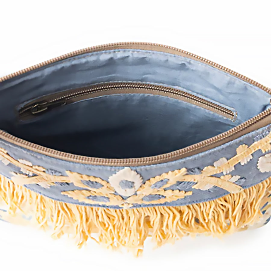 Channel vintage elegance with our two-toned crossbody bag. The front features an ornate tapestry design in rich mustard and slate, adorned with playful golden fringe, while the back offers sleek slate upcycled canvas with a practical zip pocket. Zipper-close top with detachable, adjustable shoulder strap in matching leather. Where bohemian glamour meets everyday functionality!