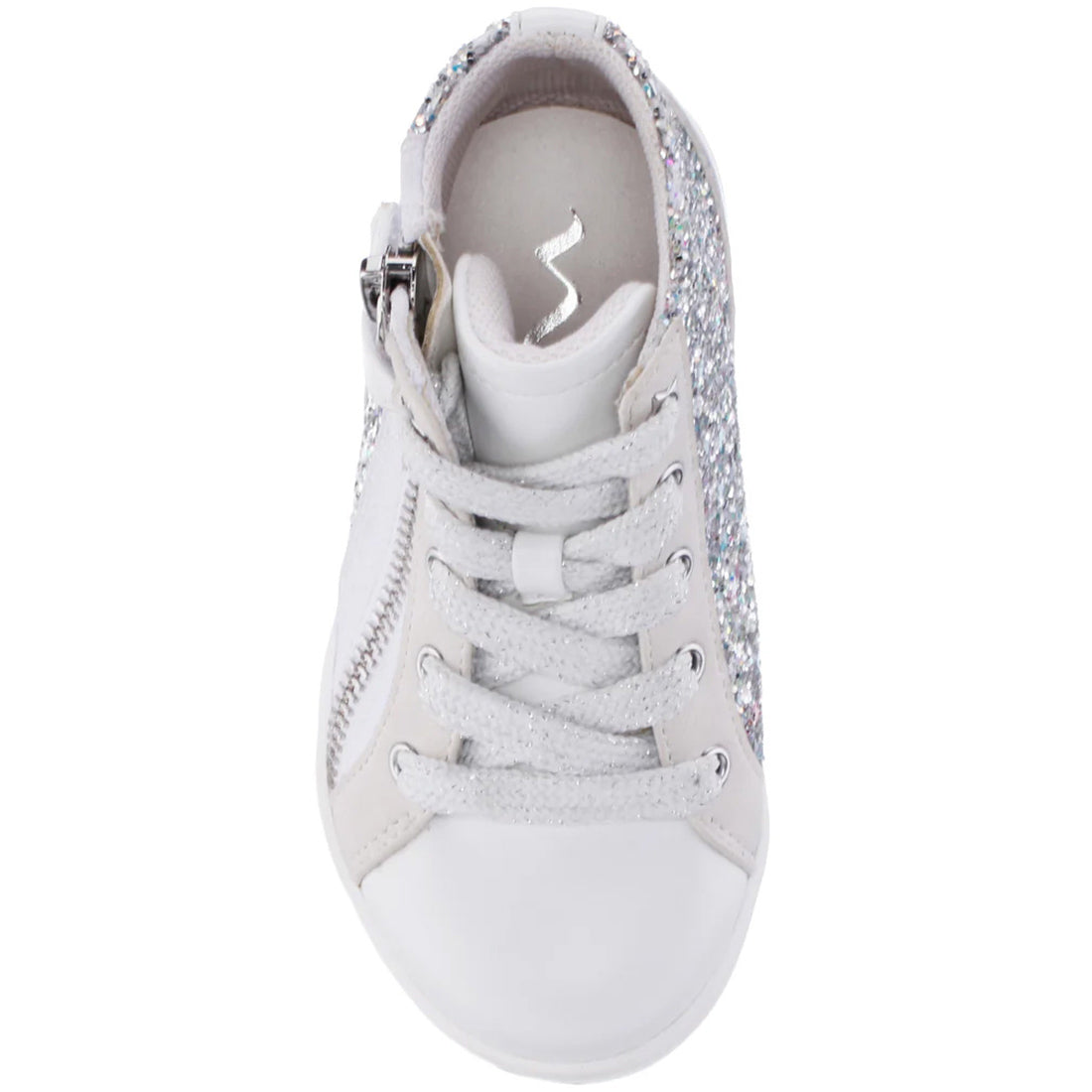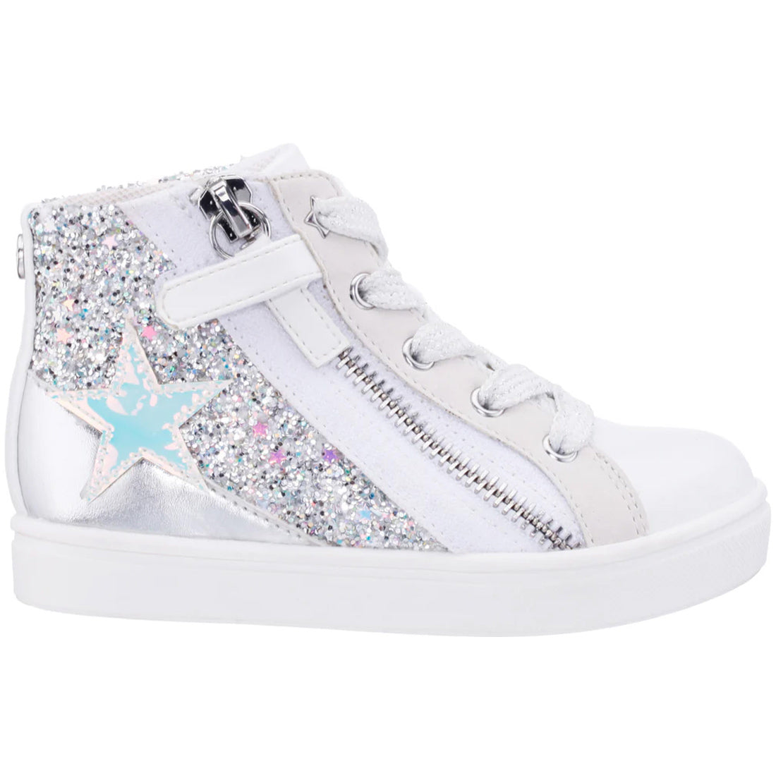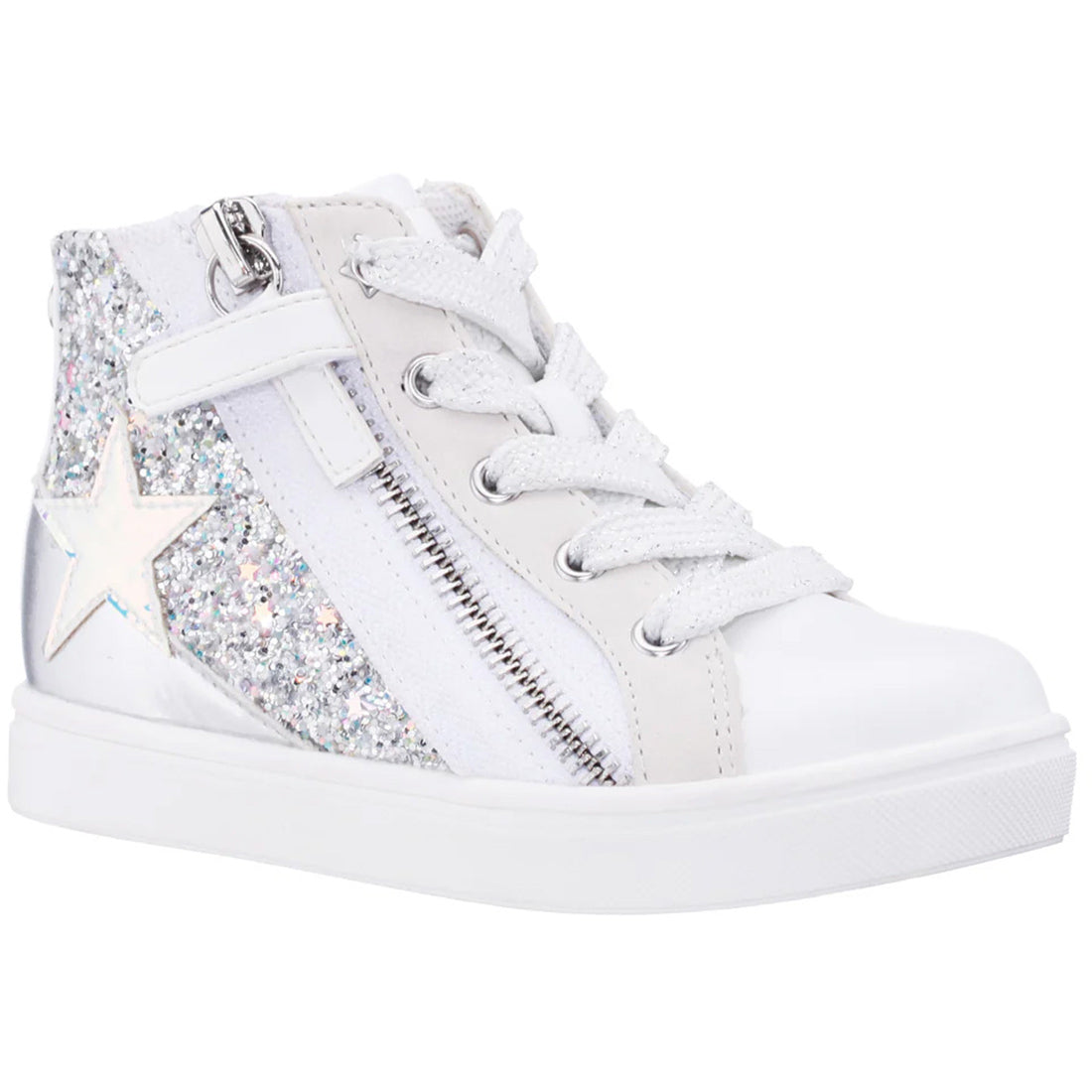 She will feel like a star in this glittery mixed material high-top sneaker with star applique. With a functional outside zipper for ease of wear, ultra comfy cushioned memory foam insole and flexible outsole; this style is bound to become one of her favorite new sneakers.