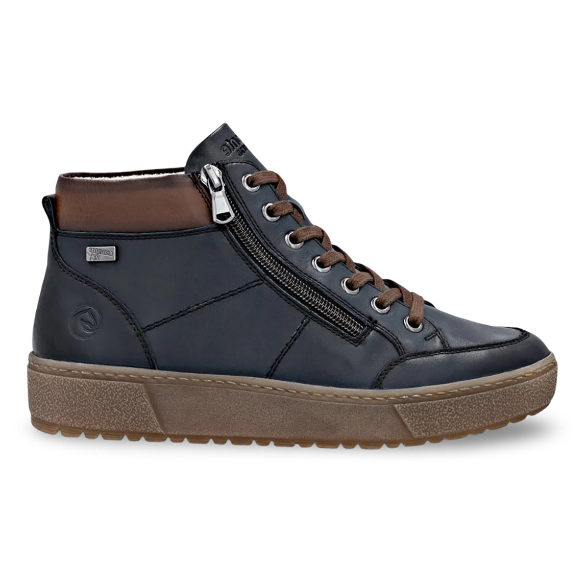 Cool style with maximum comfort! With this remonte high-top sneaker made of smooth leather is the perfect choice. The lacing complements the zipper and thus guarantees optimal support and perfect fit. The flexible and cushioning sole, together with the padded and removable insole, ensures every step to be pleasantly cushioned. The comfort width offers enough space for the feet to feel comfortable even when worn for longer periods. The shoes are equipped with a water-repellent membrane for dry feet in wind and weather. True to the motto comfort meets style!