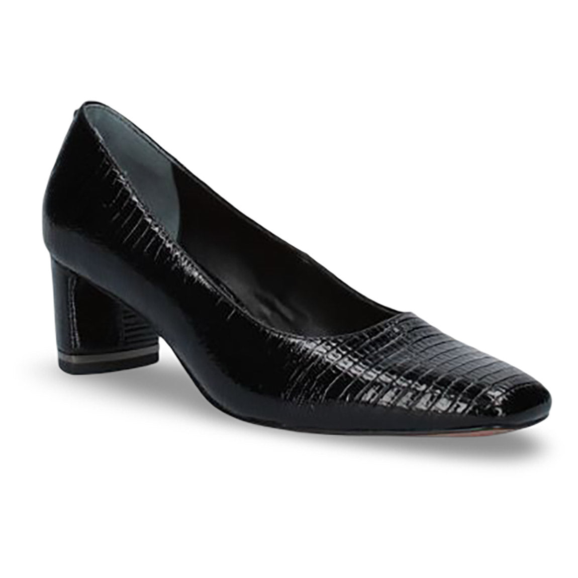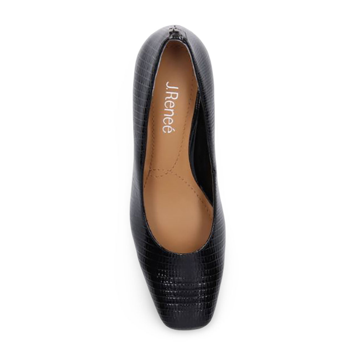 This slip on pump is made of reptile print with a synthetic lining and synthetic sole on a 2 inch block heel. This style also features a square shaped closed toe.