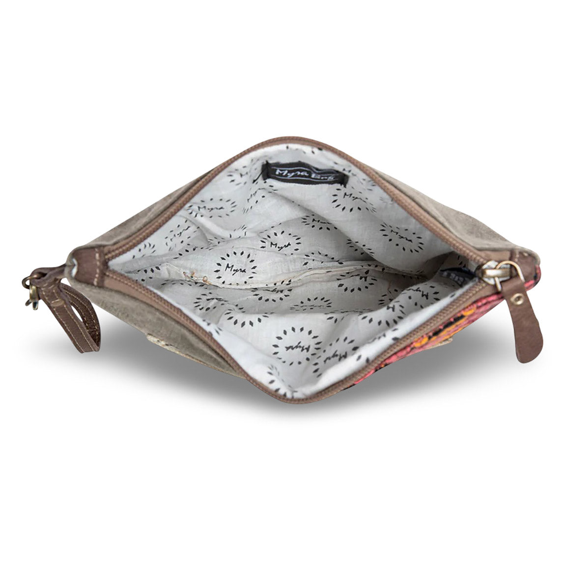 The Singapore Port of Call Western Pouch is a travel-inspired statement piece with a blend of texture and artistry. Crafted from upcycled canvas and a tribal woven rug, its patchwork design is accented with genuine leather and vintage overprinting for a well-worn, adventurous look. A secure zipper closure, inside zipper pocket, and phone compartment offer practicality, while the leather wristlet strap ensures easy carrying. Elevate your style with this western clutch purse, perfect for day or evening outings.