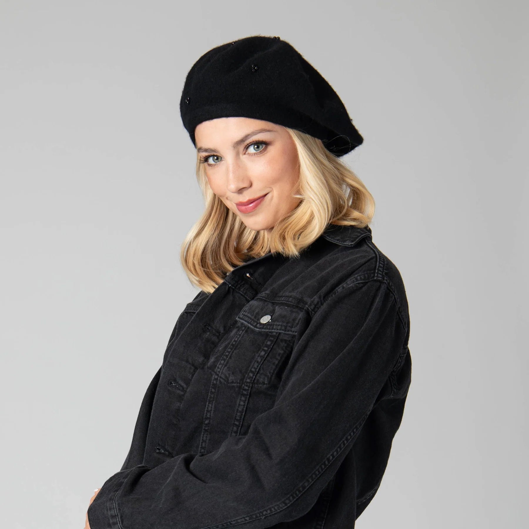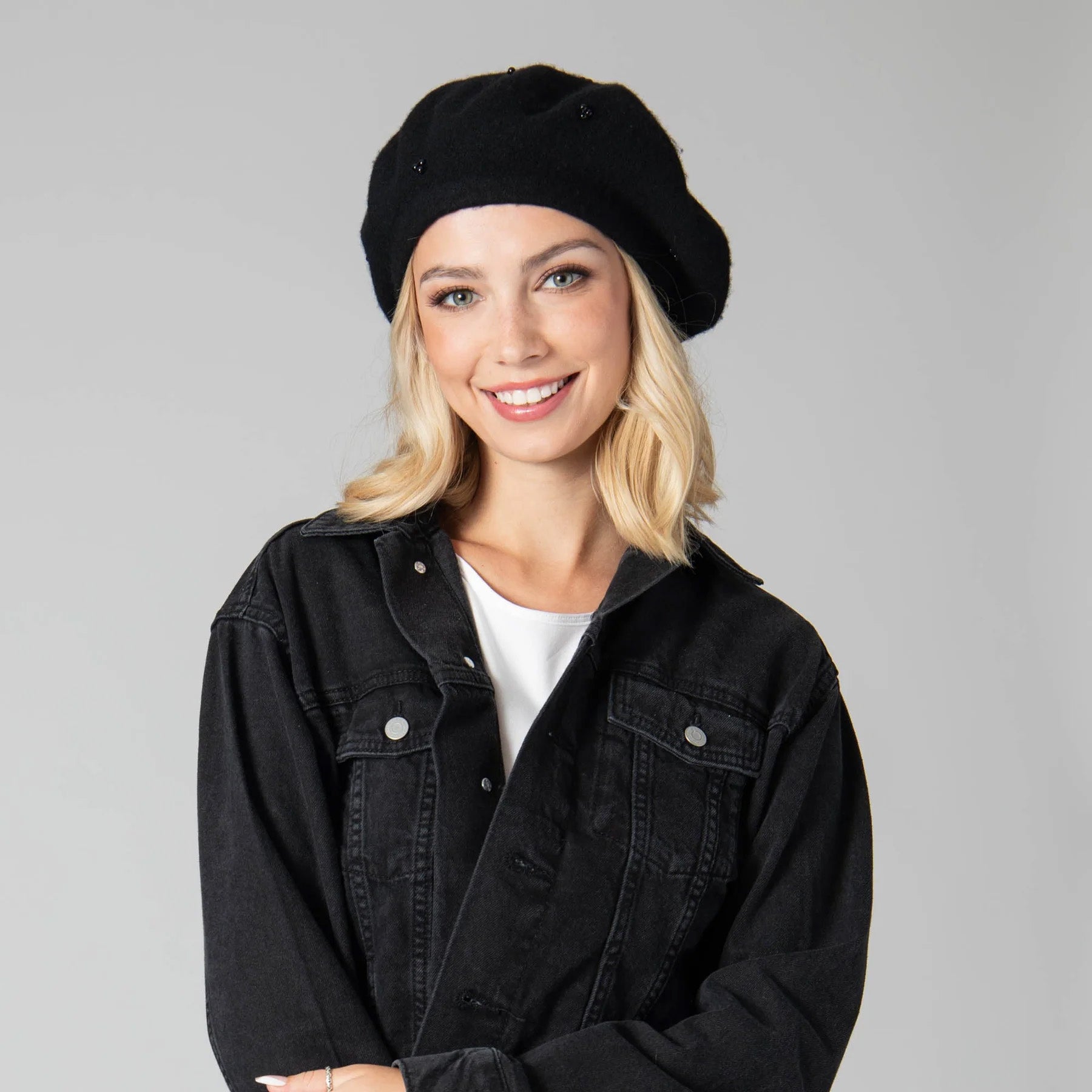 This stylish and functional wool beret is perfect for cold weather. Available in black or charcoal, it features a staggered tonal pearl cluster design for a touch of glam. Packable and lightweight, it's a great way to look fashionable while staying warm.