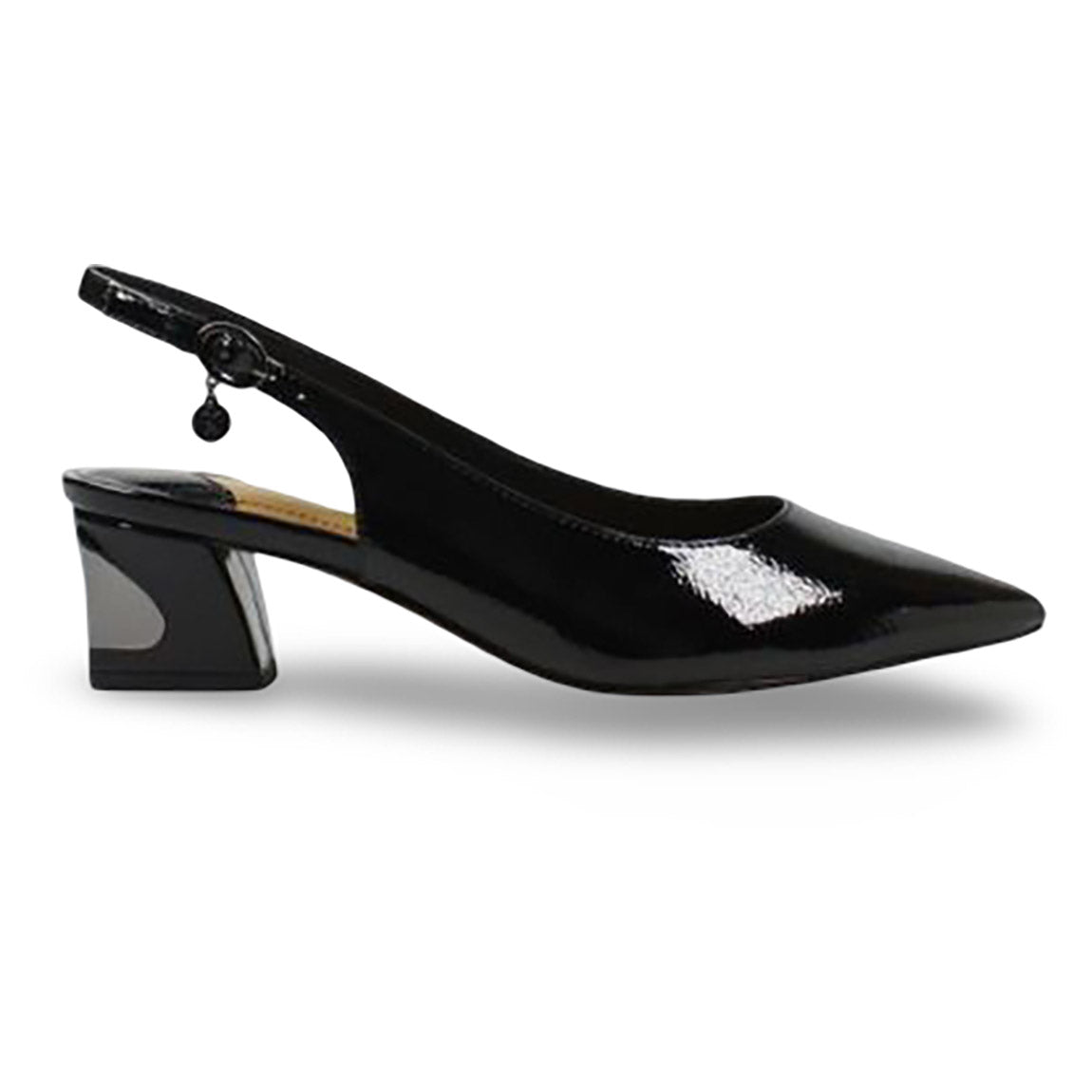This synthetic patent pump has a memory foam+latex insole and synthetic lining. This shoe has a buckle closure on a 2 inch heel.