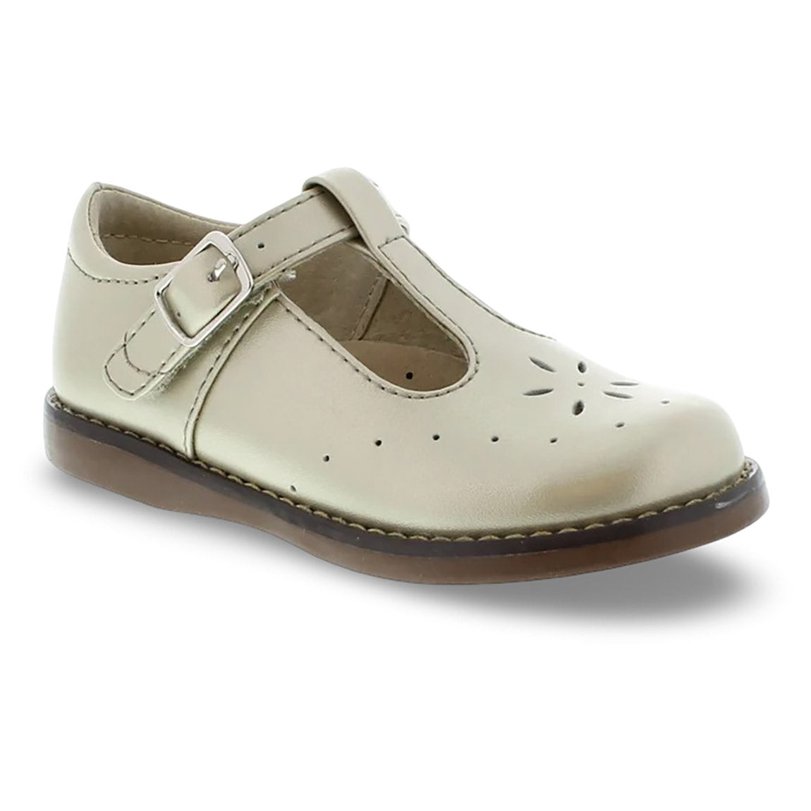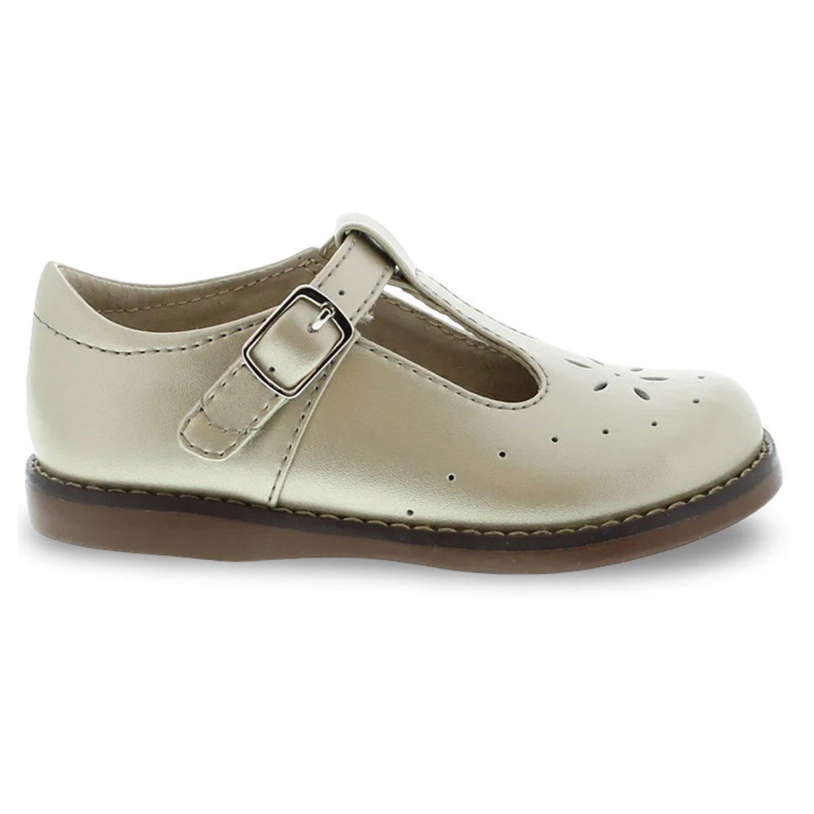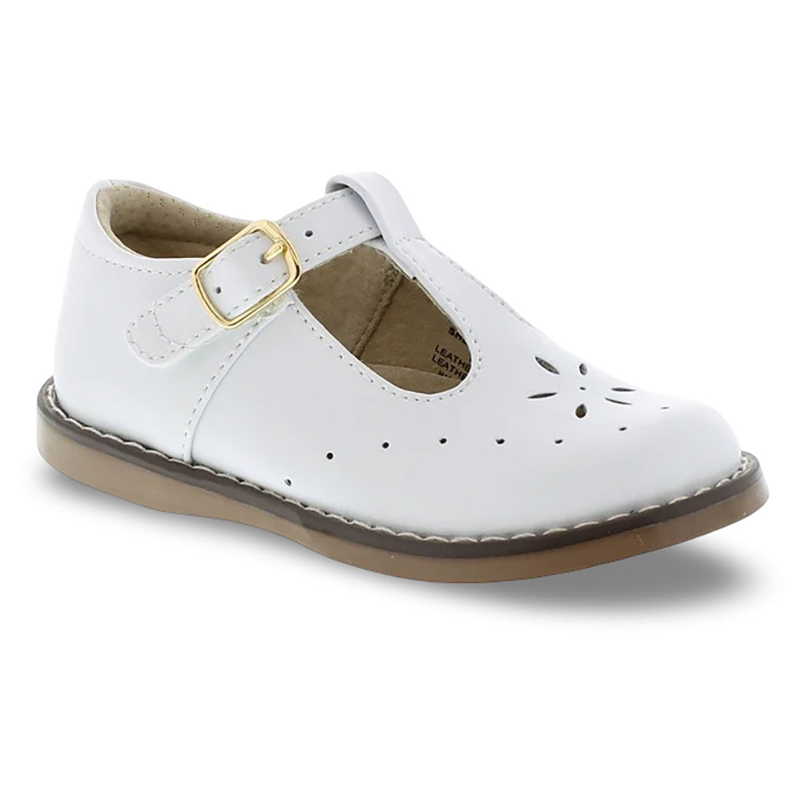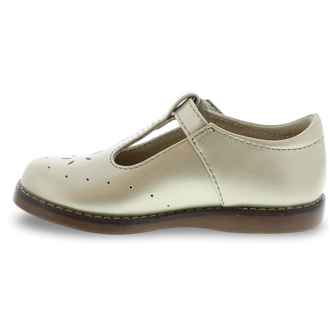Traditional leather T-Bar Mary Jane featuring hook-and-loop ankle strap with decorative buckle and star perf vamp design. Offered in matte, metallic, and patent colors; sizes ranging from 5.0 toddler - 1.0 youth.
