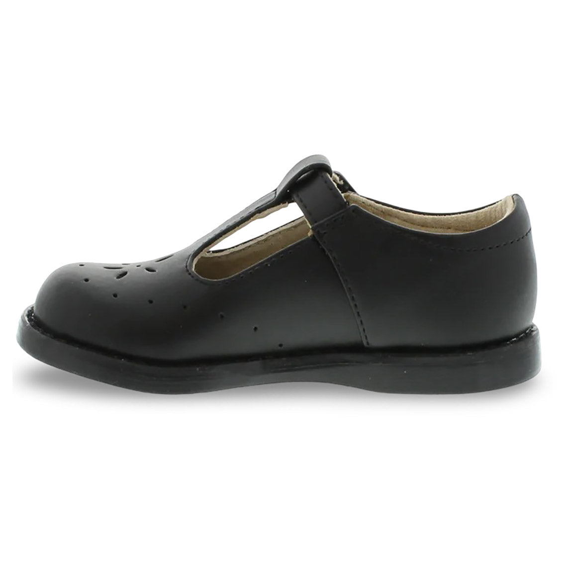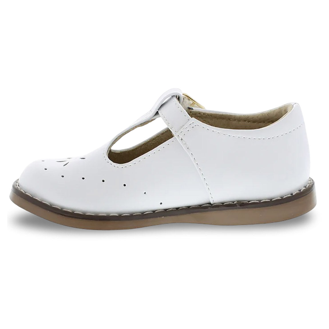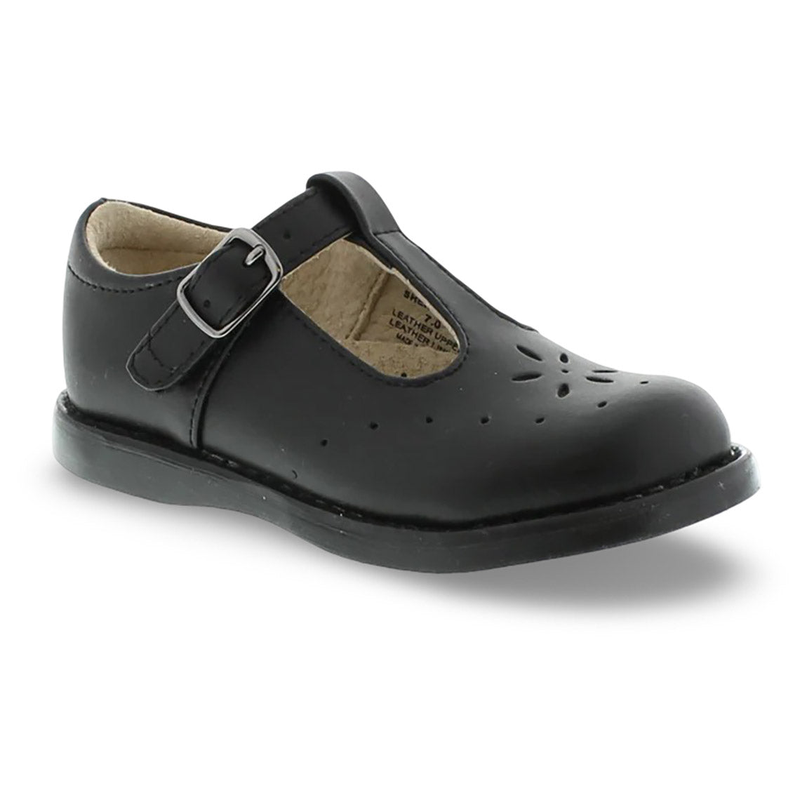Traditional leather T-Bar Mary Jane featuring hook-and-loop ankle strap with decorative buckle and star perf vamp design. Offered in matte, metallic, and patent colors; sizes ranging from 5.0 toddler - 1.0 youth.
