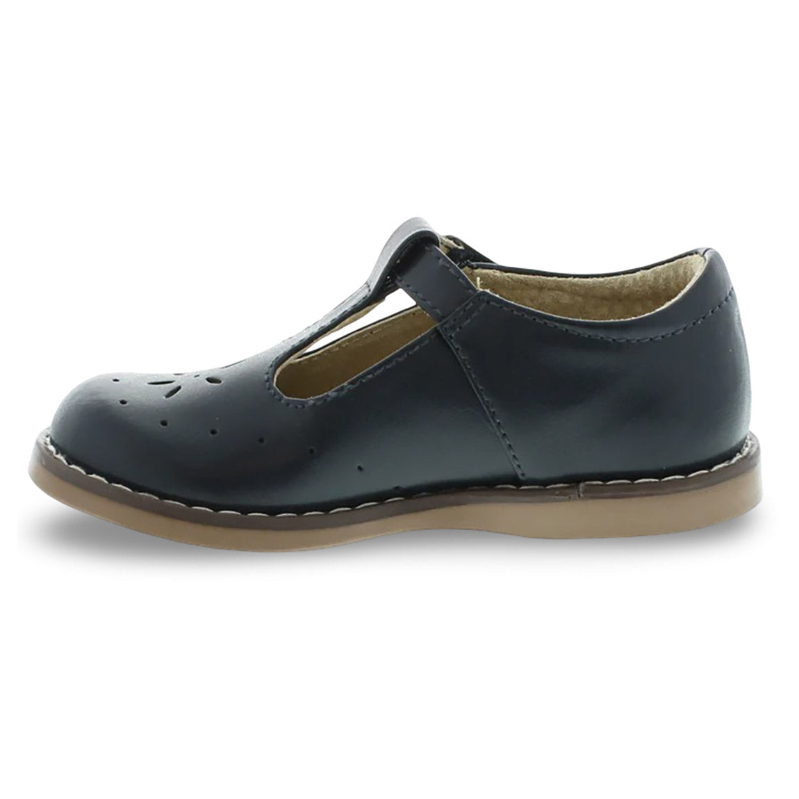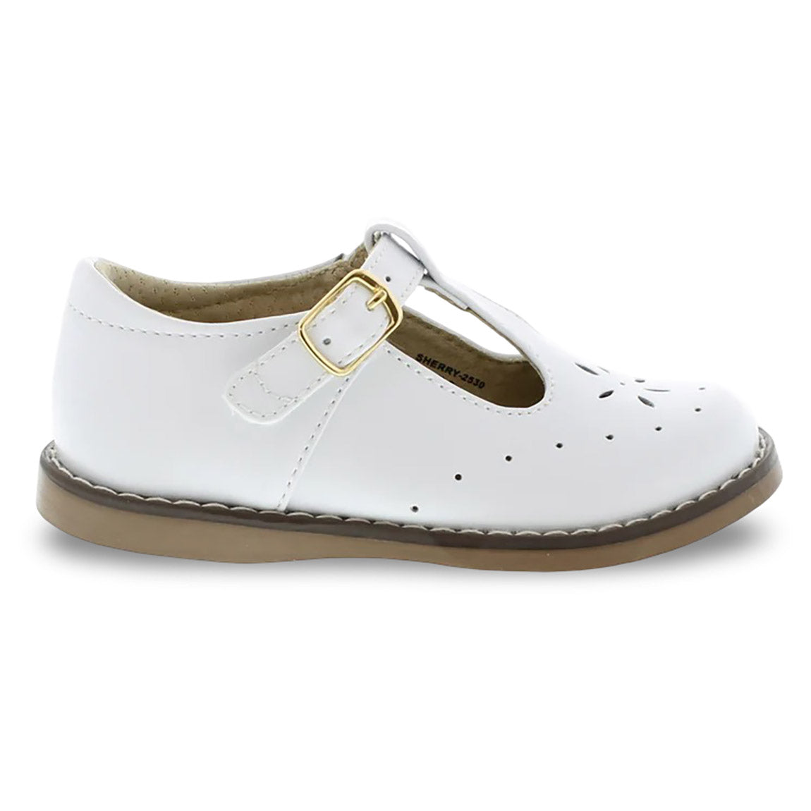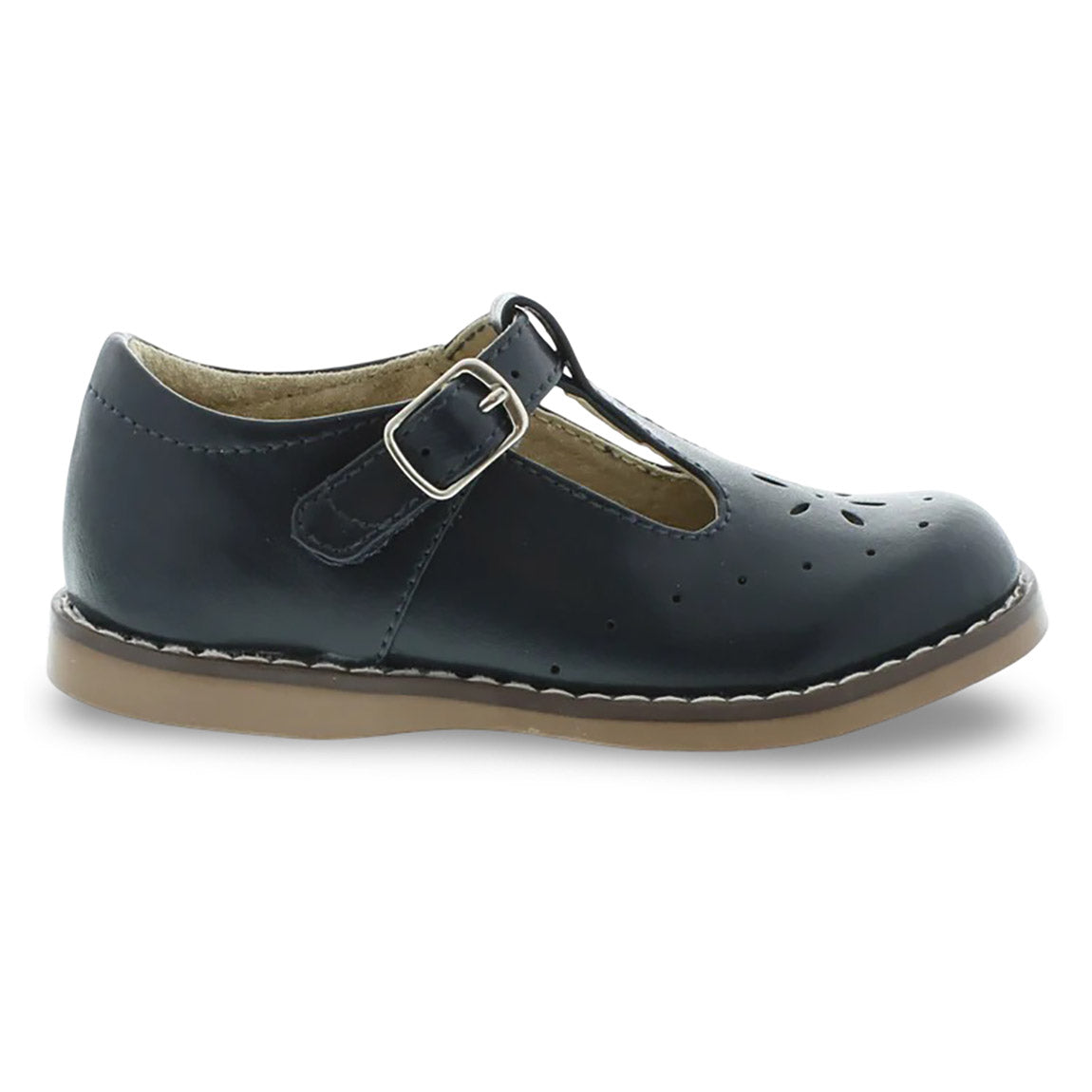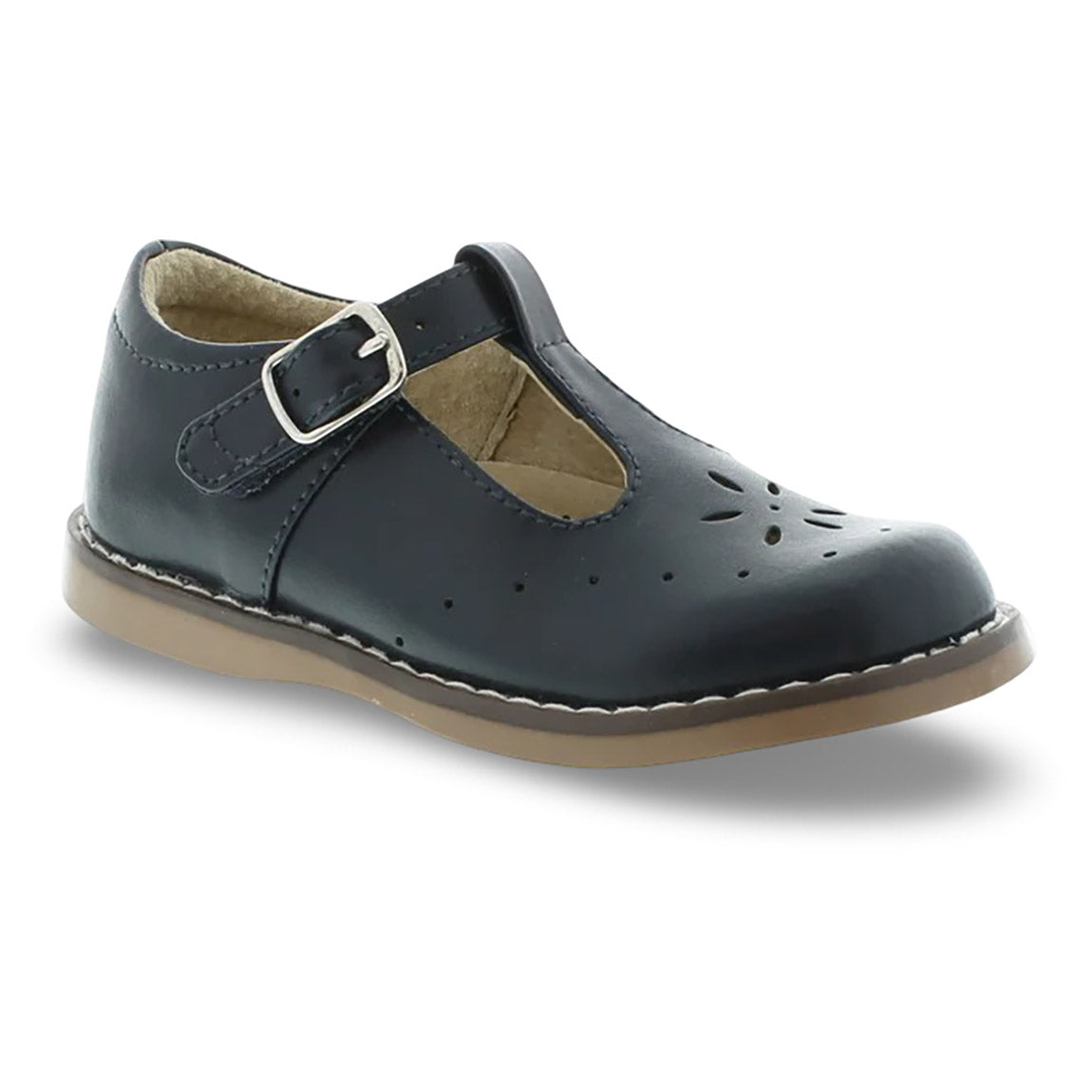 Traditional leather T-Bar Mary Jane featuring hook-and-loop ankle strap with decorative buckle and star perf vamp design. Offered in matte, metallic, and patent colors; sizes ranging from 5.0 toddler - 1.0 youth.