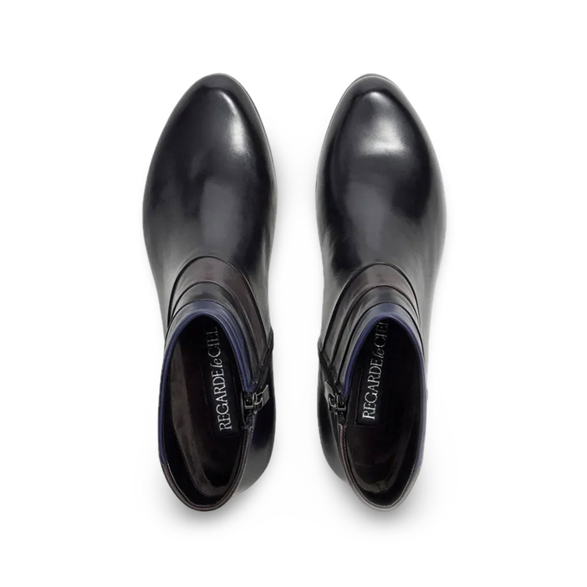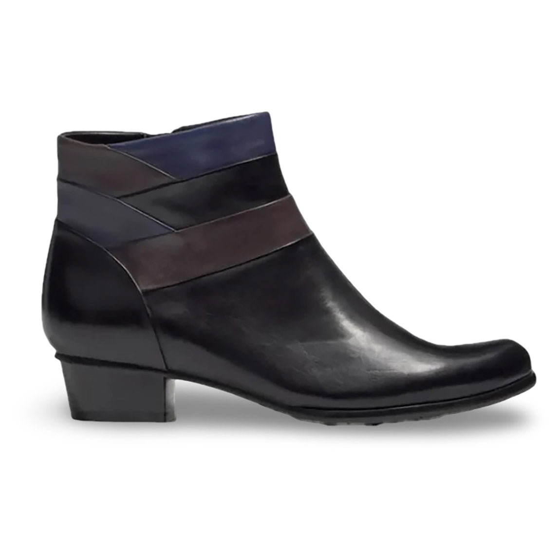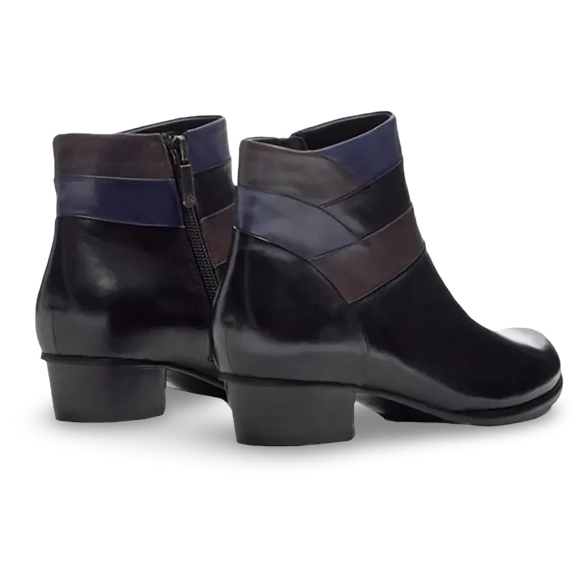 The Stefany ankle boot features a 30 mm heel, velvet lining with short hair fur, and an interior zipper. It includes a leather patchwork details, and accentuated stitching. Composition: Glove leather in Black, Muddy, Melanzana.
