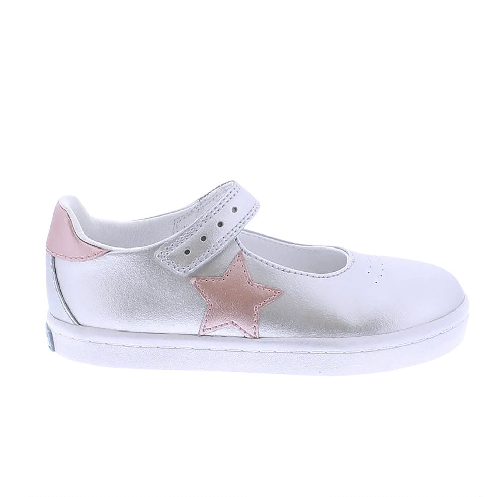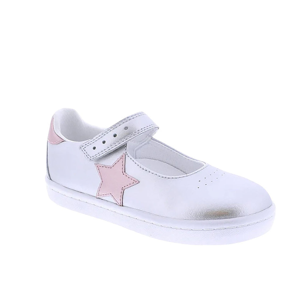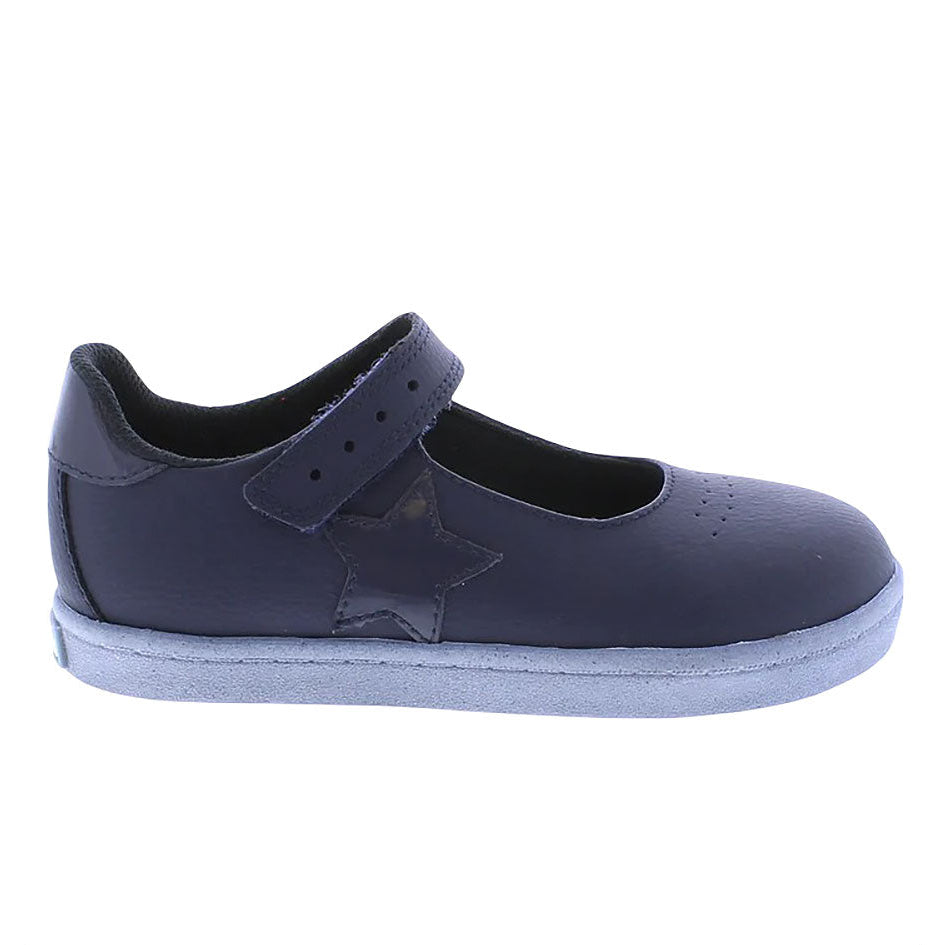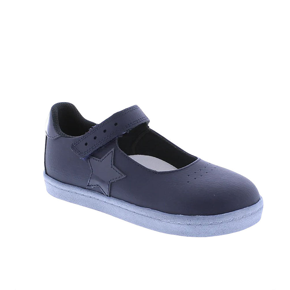 Leather Mary Jane featuring hook-and-loop closure, decorative star applique and perforations, with an antique finish on outsole profile. Offered in matte and metallic colors; sizes ranging from 3.0 infant - 3.0 youth.