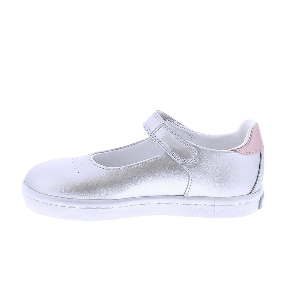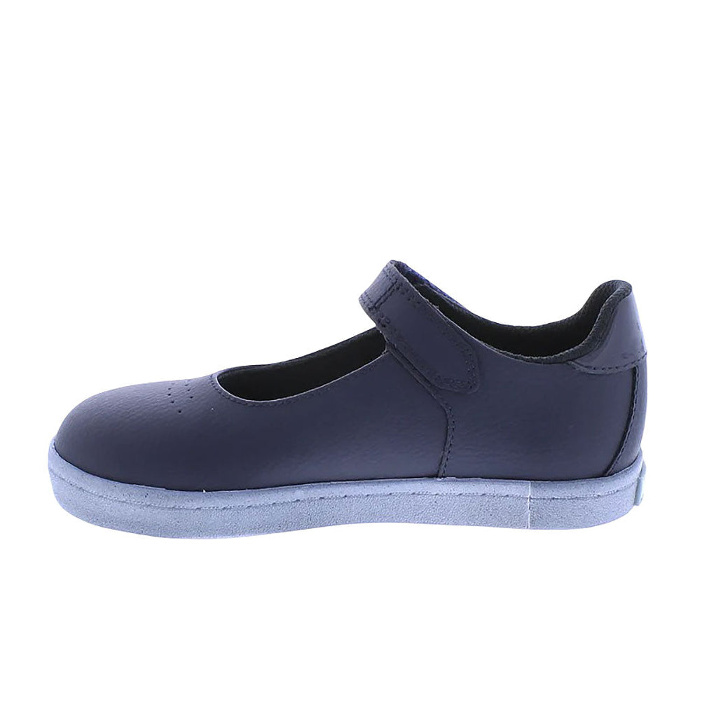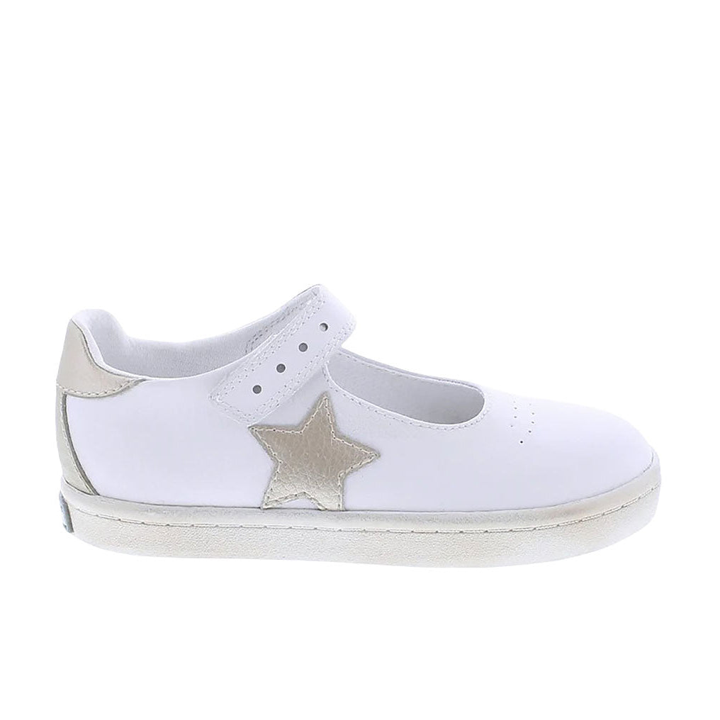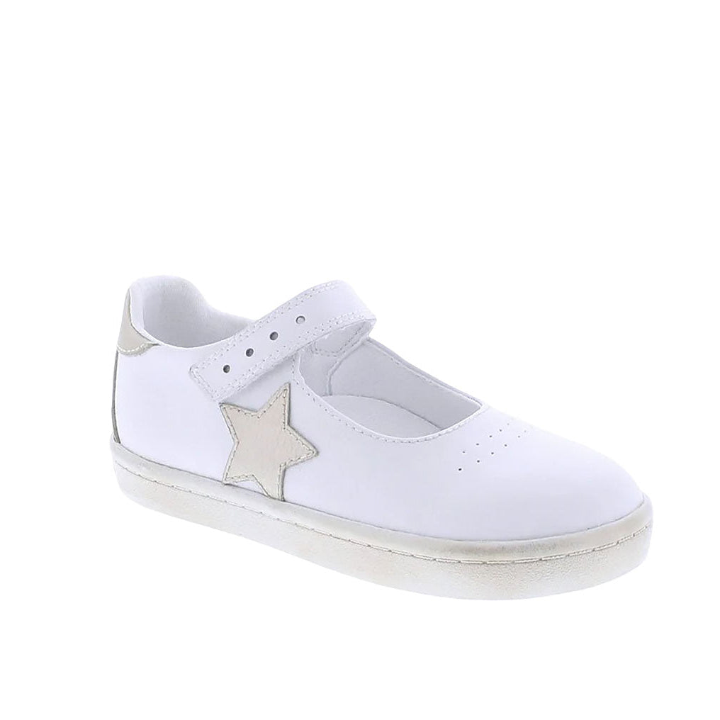 Leather Mary Jane featuring hook-and-loop closure, decorative star applique and perforations, with an antique finish on outsole profile. Offered in matte and metallic colors; sizes ranging from 3.0 infant - 3.0 youth.
