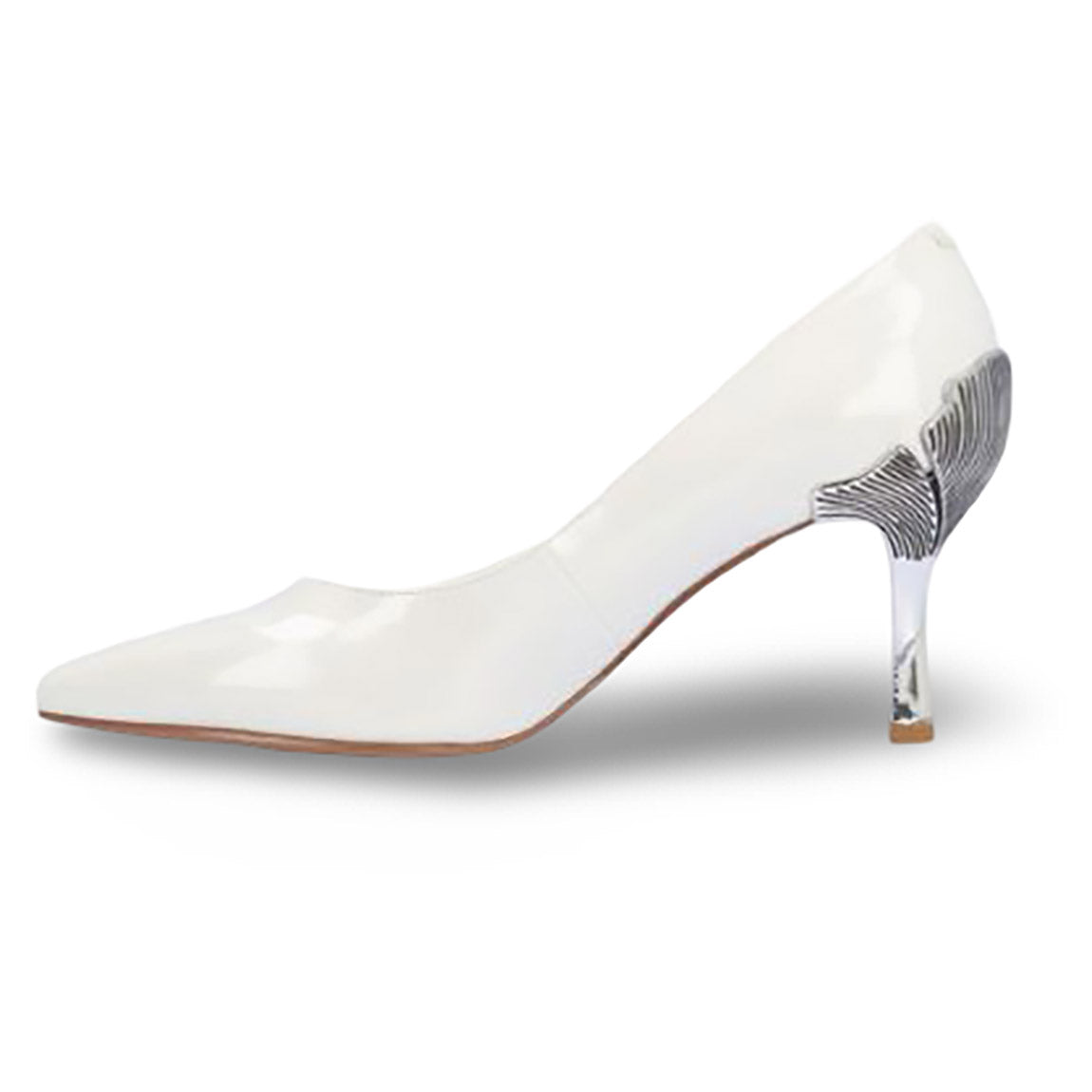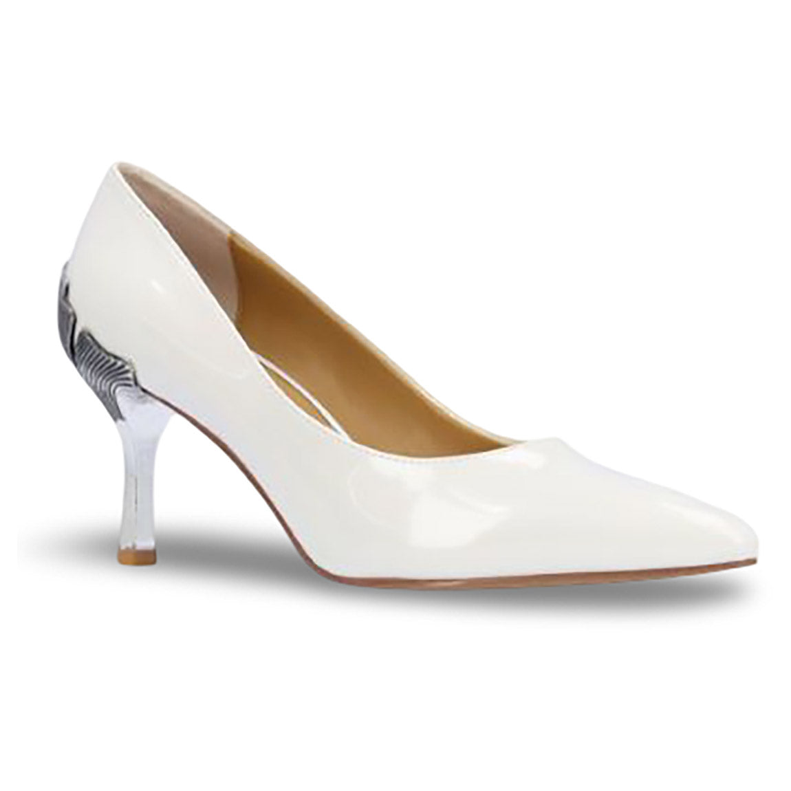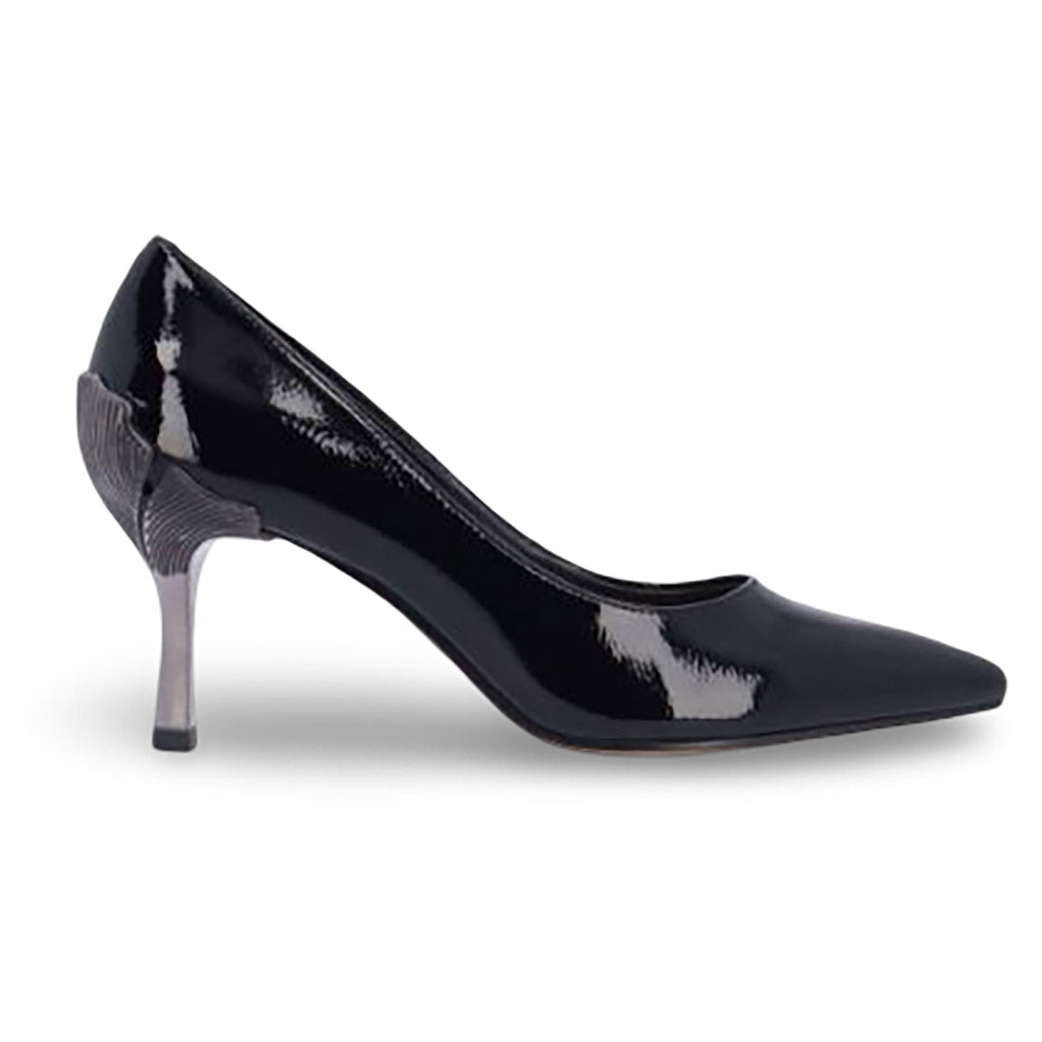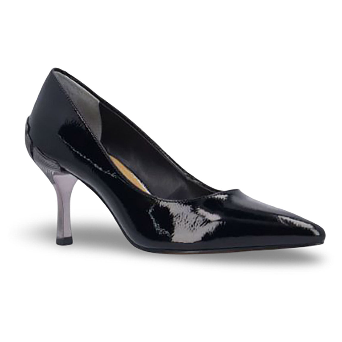 This patent pointy toe pump has a memory foam+latex insole, synthetic lining and synthetic outsole. This slip on shoe is on a 2.75 inch heel.