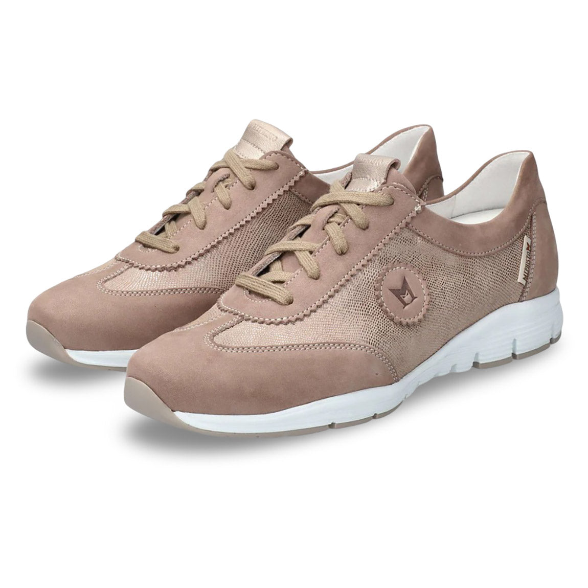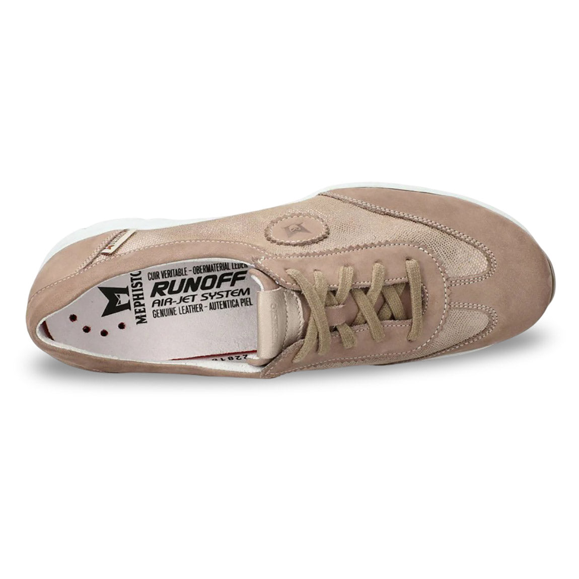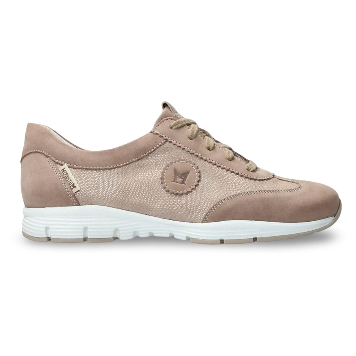 Ultra-lightweight and extremely well-tailored, these lite weight, active sneakers feel as amazing on as they look from the outside. From the ground up, every detail is designed with one aim in mind: to create the lightest, most comfortable, most capable sneaker imaginable. They don’t just fit your feet, they fit your life: International adventure or years of day-in/day-out duty, you’ll never look back once you’ve laced them up. Exclusive design in the footbed circulates fresh air for added breeziness, while shock absorbing technology in the heel keeps you feeling light on your feet – and protects your joints and back from strain – for hours on end. This beige women's sneaker is made from nubuck leather over the entire foot, with glittery metallic-effect leather and metallic-effect leather inserts.